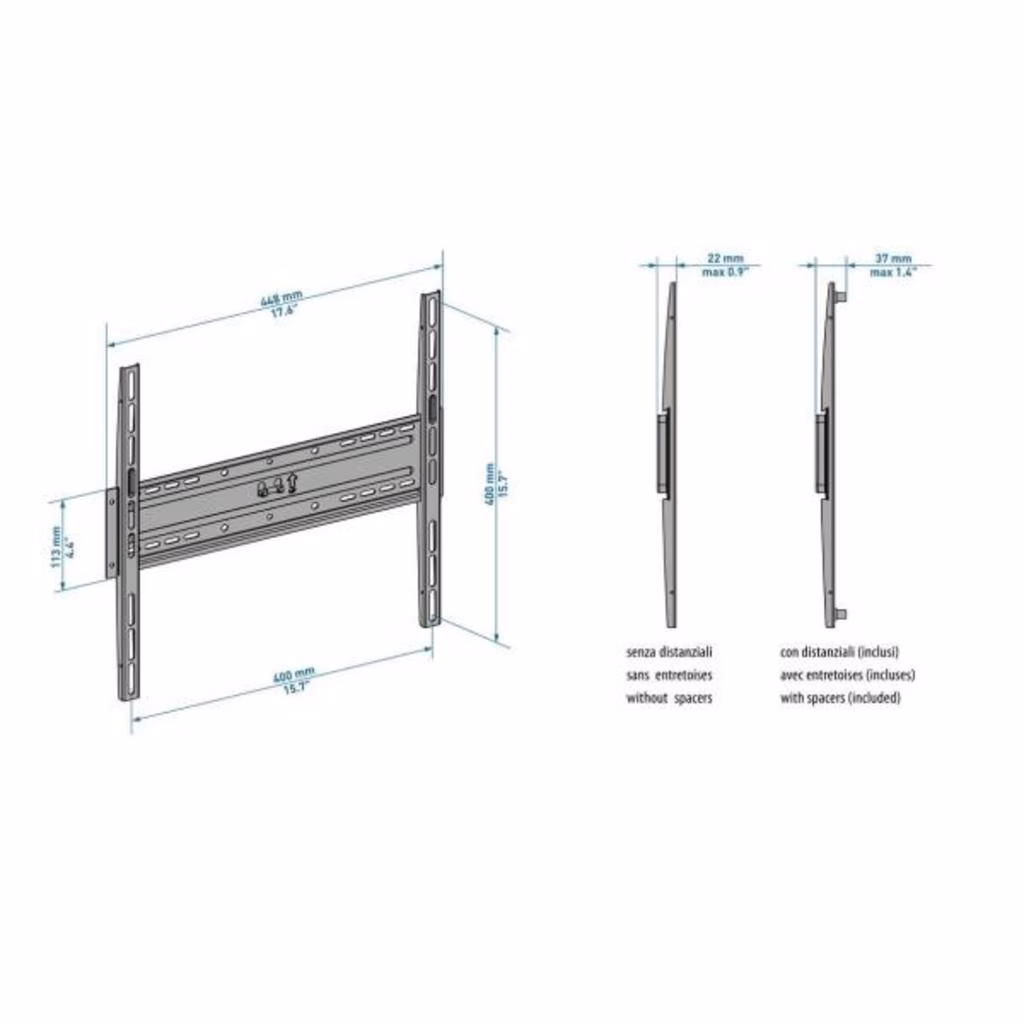 CME è la linea di supporti economici ideata per chi cerca la qualità Meliconi a prezzi contenuti. Il modello ES400 è un supporto TV da parete fisso compatibile con tutte le TV dotate di foratura VESA 200-300-400 mm. La sua principale caratteristica è l estrema sottigliezza, che consente alla TV di aderire perfettamente alla parete, dando l effetto di un quadro appeso. Ideale per chi cerca una soluzione discreta e funzionale, l ES400 è un supporto TV da parete fisso che combina design e praticità. Realizzato al 100% in Italia, garantisce affidabilità e stile in ogni ambiente.