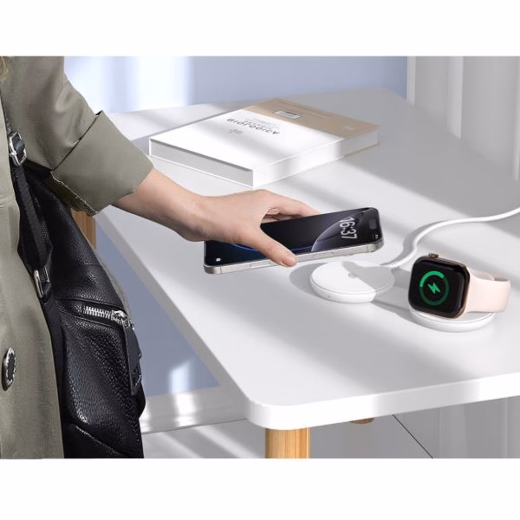 Prova la ricarica senza sforzo con il caricabatterie wireless magnetico pieghevole 2 in 1. Questa soluzione intelligente e compatta alimenta contemporaneamente il tuo iPhone e Apple Watch, aiutandoti a ridurre l'ingombro dei cavi e a mantenere il tuo spazio organizzato.