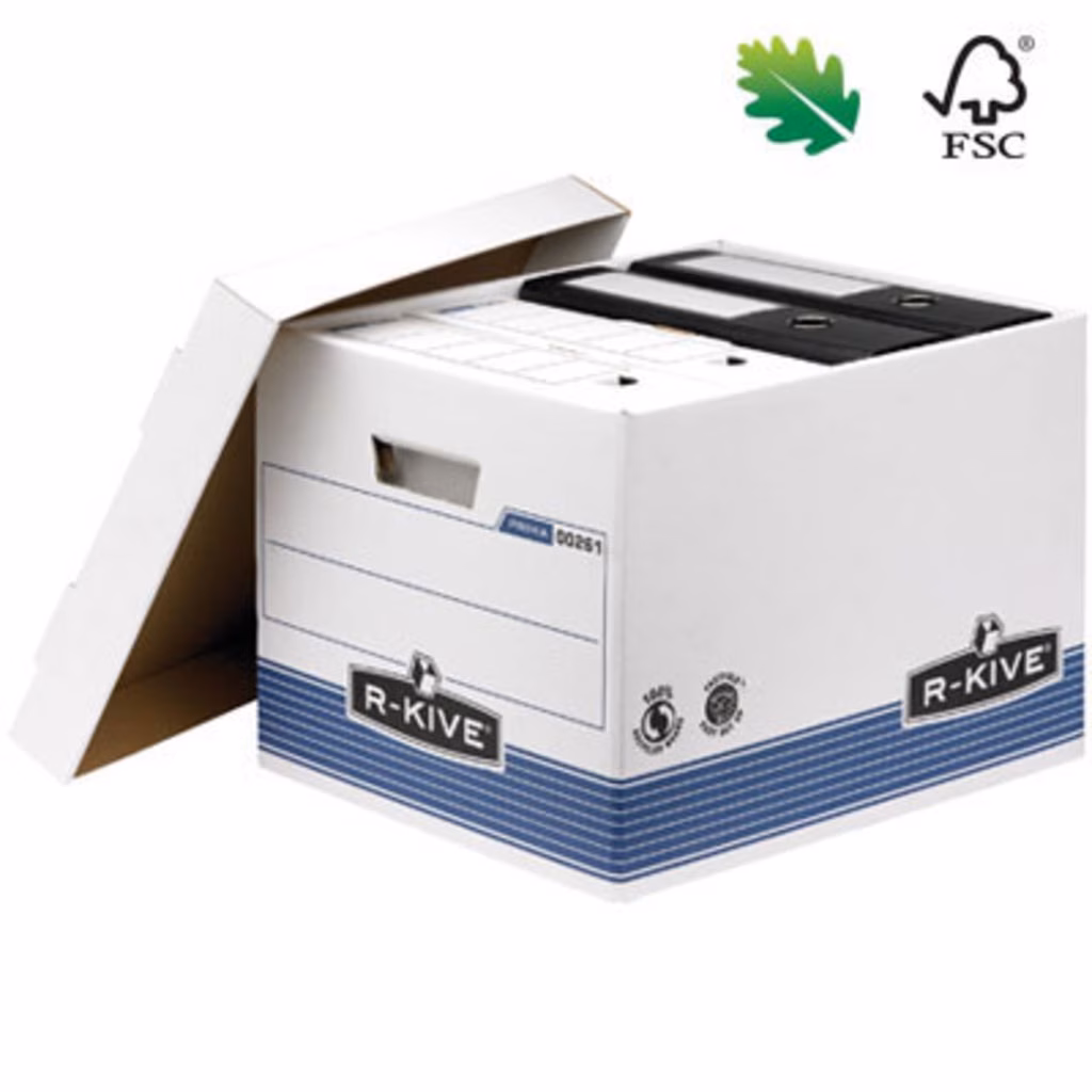 Scatola archivio formato A4 con assemblaggio automatico FASTFOLD. Patella di chiusura per una maggiore sicurezza. Aree etichettabili sui dorsi, prodotto in cartone certificato FSC, riciclabile 100%. Colore bianco/blu