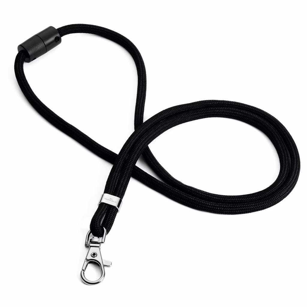 Cordoncino in tessuto realizzato con PET riciclato, con sgancio di sicurezza antisoffocamento che si apre quando viene strattonato. Forma tubolare e dotato di moschettone Ideale per portanome o portabadge con foro di aggancio o come portachiavi Lunghezza cordoncino: 46 cm