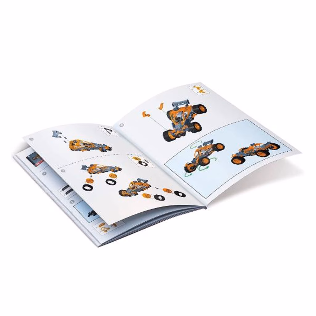 Il kit contiene oltre 100 pezzi per costruire 2 diversi modelli dotati di meccanismi a trasmissione.