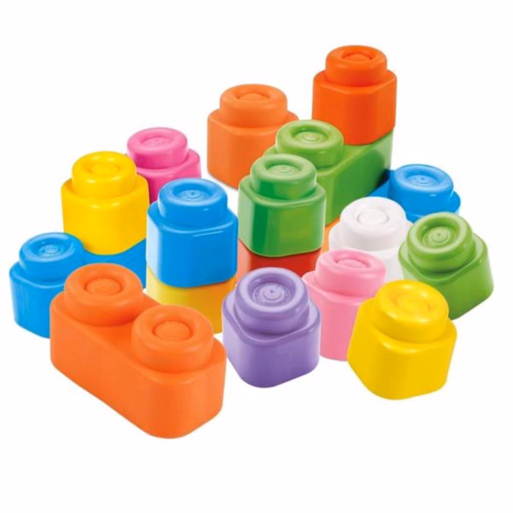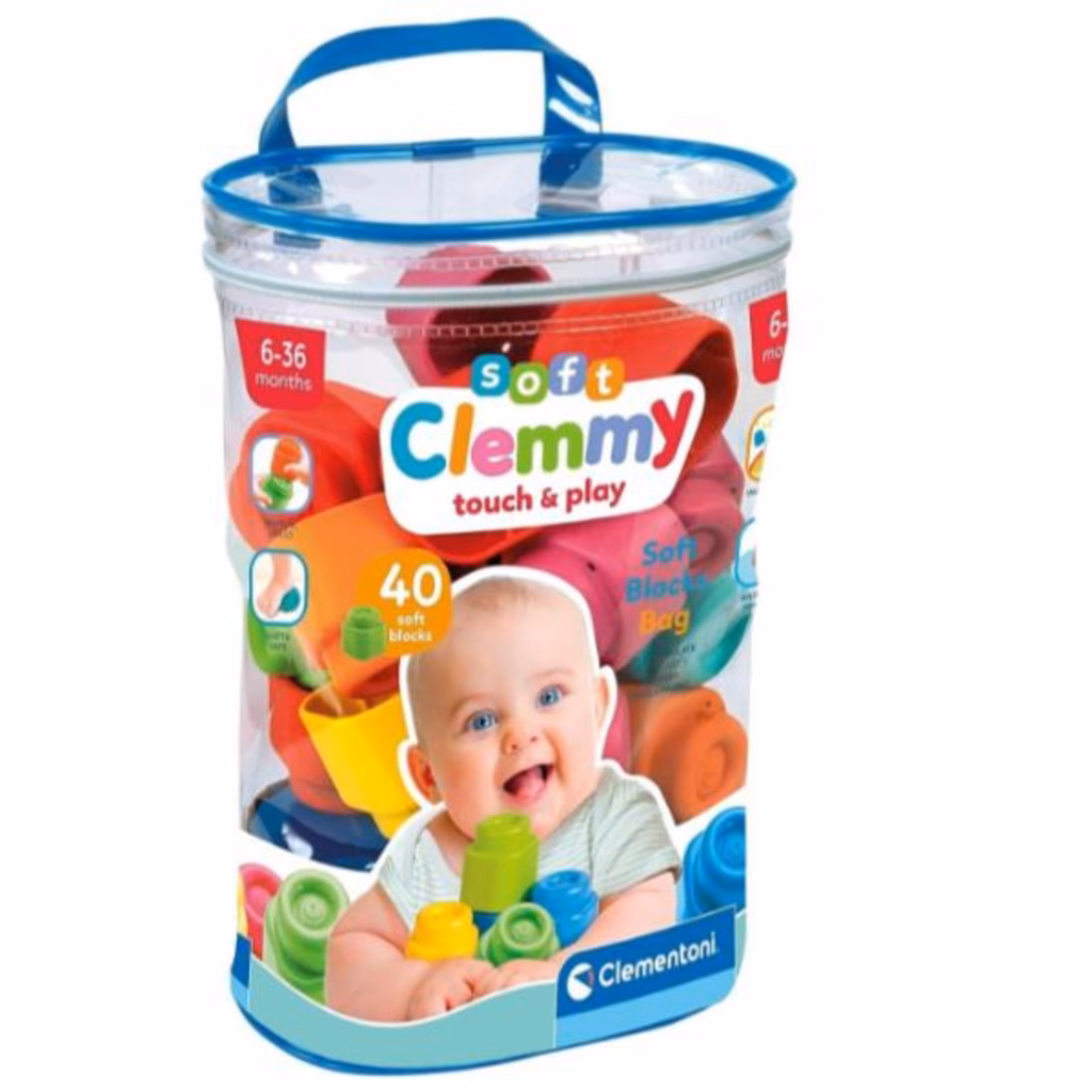 La sacca trasparente contiene 40 coloratissimi mattoncini Soft Clemmy, studiati per far giocare i bambini dai 6 ai 36 mesi in tutta sicurezza.