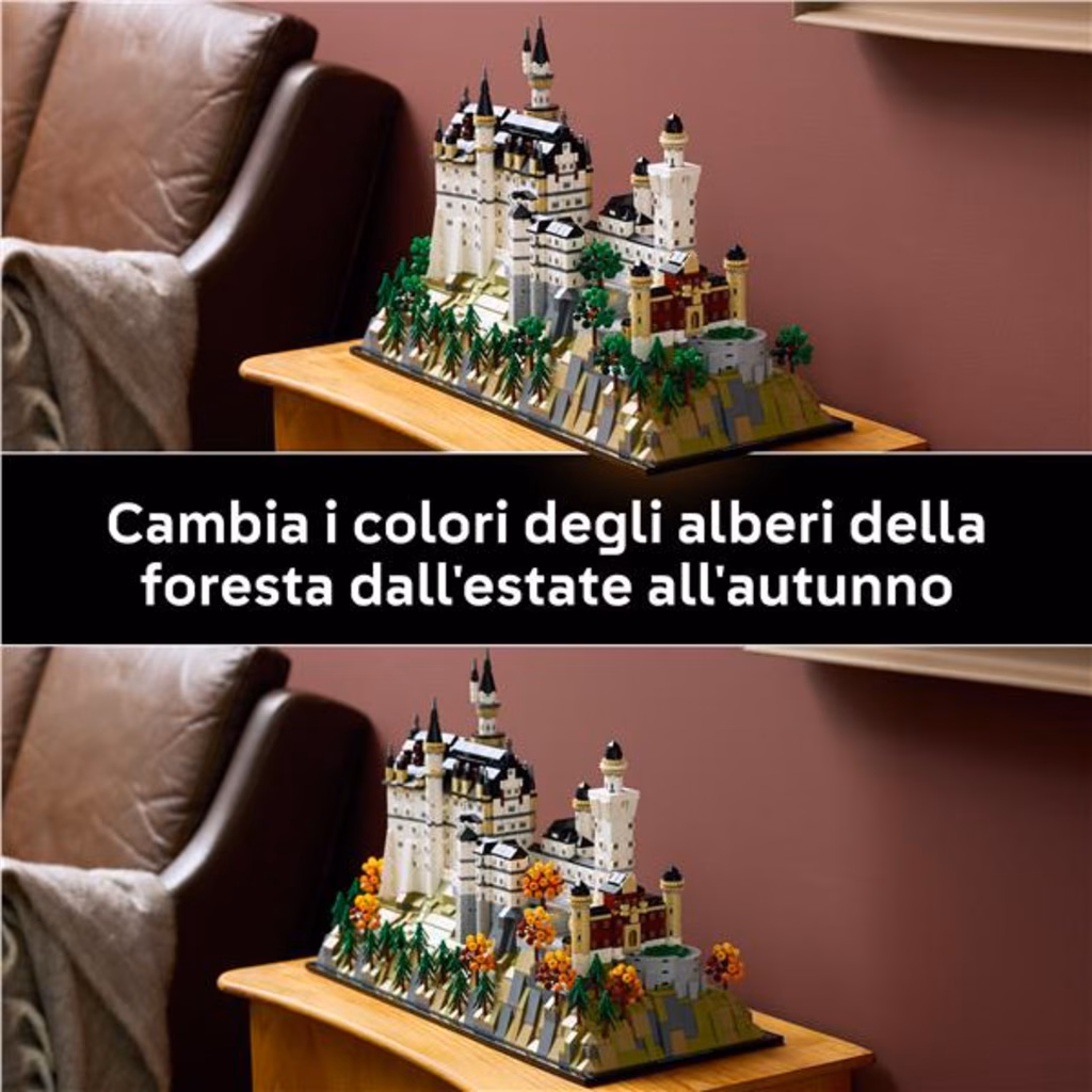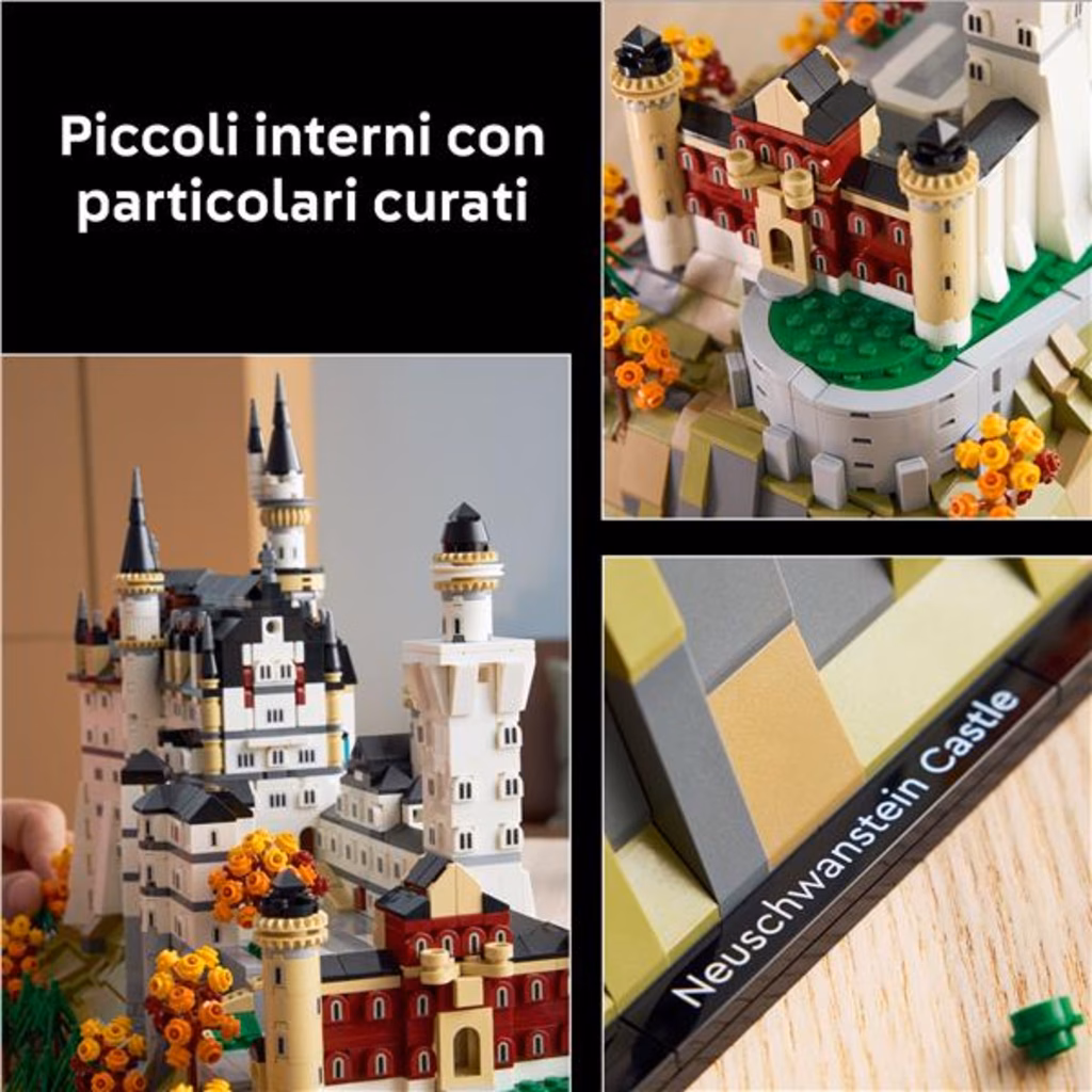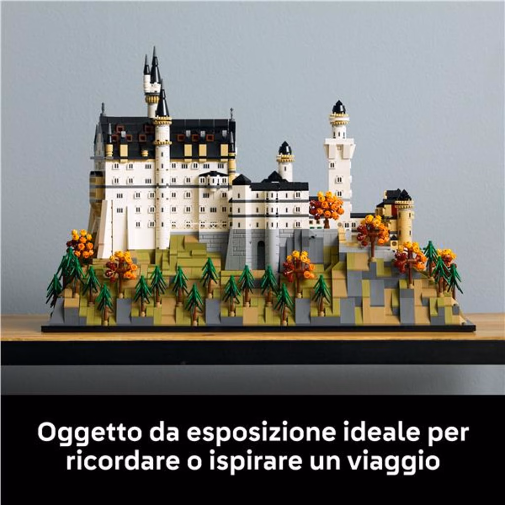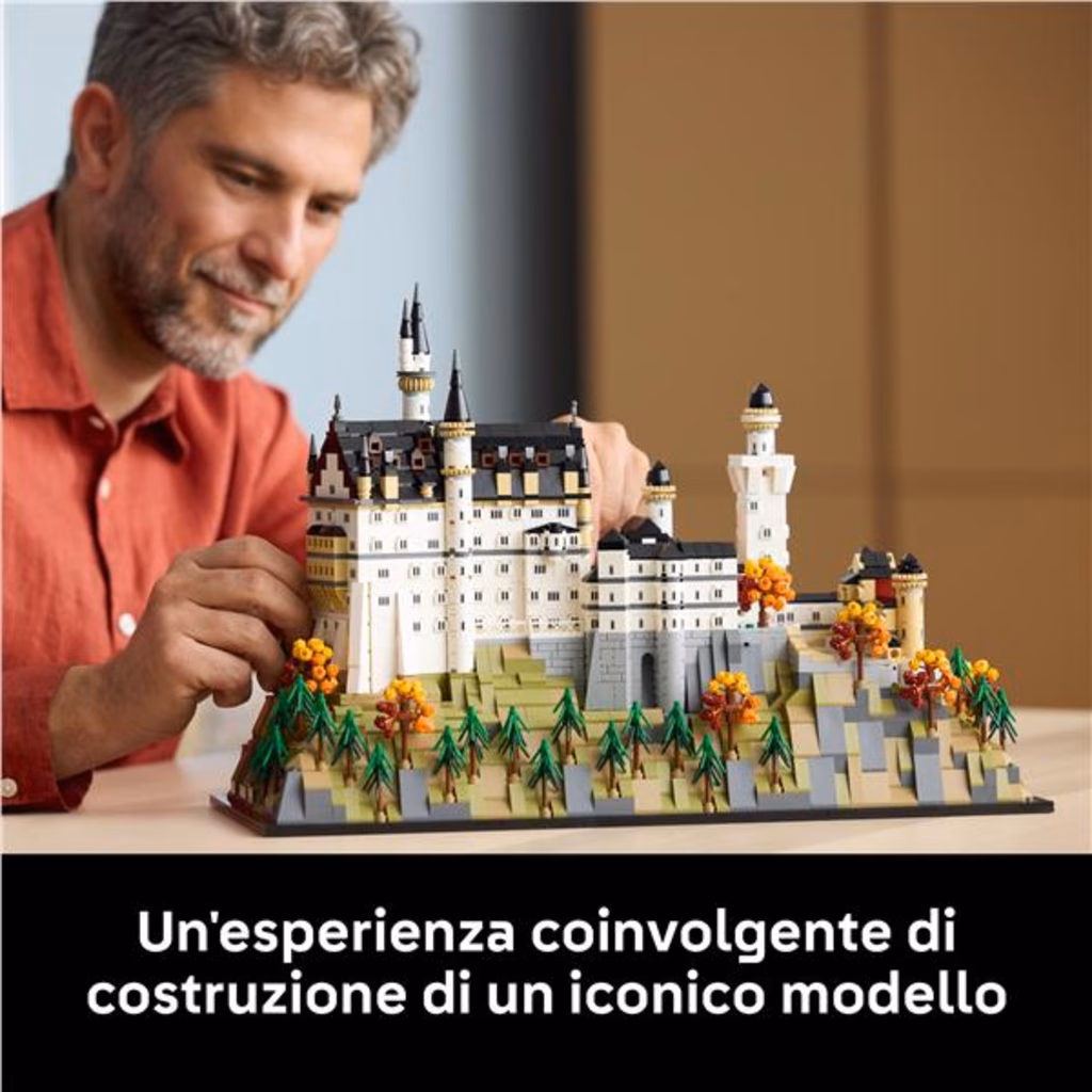 Tuffati nella tua passione per i monumenti iconici con questo set da costruzione di 3.455 pezzi del Castello di Neuschwanstein LEGO® Architecture (21063) per adulti. Dedicati alla costruzione di un oggetto da esposizione, che è anche un fantastico regalo architettonico per te o per altri amanti della storia. La costruzione è piena di sorprese dalle guglie esterne, le torrette, il cortile, le scale e i tetti a capanna ai piccoli modelli interni. Inoltre, il fogliame degli alberi circostanti può essere modificato per rappresentare un paesaggio estivo o autunnale. Tanta serenità ti aspetta mentre costruisci questo dettagliato set di castello LEGO.Scopri le tecniche di costruzione aggiornate e un esperienza 3D intuitiva con l app LEGO Builder mentre ricrei una rappresentazione fedele del Castello di Neuschwanstein. Questo set premium, ricco di dettagli, piacerà a te e a tutti gli adulti creativi che amano la storia europea, i viaggi o i castelli e i palazzi d Europa. È un regalo di grande effetto che ogni appassionato di architettura o di costruzioni LEGO sarà orgoglioso di possedere ed esporre.Kit con monumento: immergiti in ogni dettaglio della ricostruzione architettonica di una famosa destinazione bavarese con questo set del Castello di Neuschwanstein di 3.455 pezzi, pensato per adulti appassionati di architettura e modellismoUn pezzo di storia europea: il tuo viaggio di costruzione ti permette di ricreare il castello bavarese in tutto il suo splendore, scoprendo anche tecniche di costruzione aggiornate e molto altroSet da costruzione autenticamente dettagliato: ammira le altissime torri del castello, goditi il paesaggio con gli alberi estivi o autunnali e segui il sentiero per esplorare il cortileAttività rilassante per adulti: gli alberi nel paesaggio possono rappresentare l estate o l autunno, la base anteriore del castello LEGO® può essere dotata di targhetta e il modello può essere quindi esposto con orgoglio in ogni cameraRegalo architettonico: questo set da collezione LEGO® è un regalo da esporre, perfetto per te o per un adulto creativo appassionato di storia, architettura, viaggi o monumenti iconici europeiImmergiti nella costruzione: trova ogni fase della costruzione nel libretto incluso e nell app LEGO® Builder dove potrai ingrandire e ruotare i tuoi modelli in 3D, seguire i progressi e salvare tutti i tuoi set in un unico postoSet da costruzione LEGO® per adulti: questo modello LEGO Architecture fa parte di un assortimento di set di costruzione di qualità premium (disponibili separatamente) per adulti come te che amano le attività creative praticheDimensioni: questo modello architettonico da display del Castello di Neuschwanstein, composto di 3.455 pezzi, misura 31 cm di altezza, 46 cm di larghezza e 20 cm di profondità
