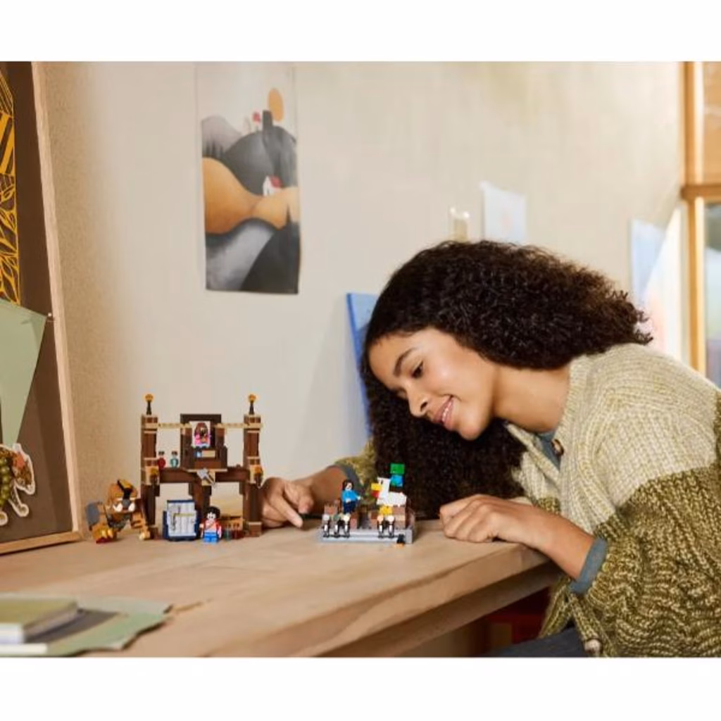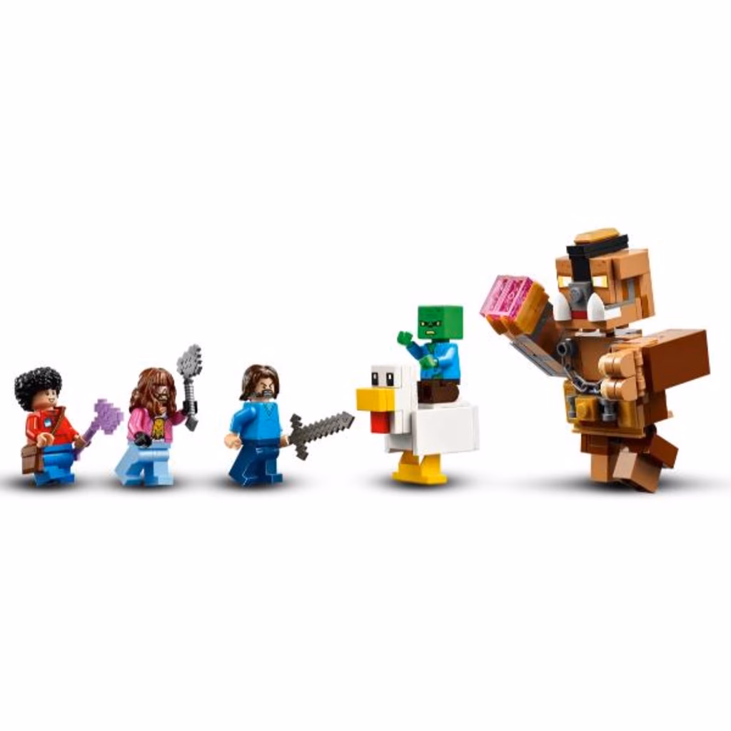 Il set costruibile LEGO® Minecraft contiene i personaggi giocattolo del film Steve, Garrett, Henry, un Bimbo Zombie, un Fantino di galline e un Grande maiale snodabile oltre ad armi e pozioni che i bambini possono utilizzare per ricreare scene di battaglia ed esplorare le loro avventure. Il set contiene anche un ring di combattimento funzionale con segnapunti e maniglie che i bambini possono fissare ai combattenti. Ci sono anche la facciata di una villa con un forziere rimovibile e un porta-armi. Per il divertimento digitale, l app LEGO Builder consente ai bambini di ingrandire, ruotare i modelli in 3D e monitorare i loro progressi.