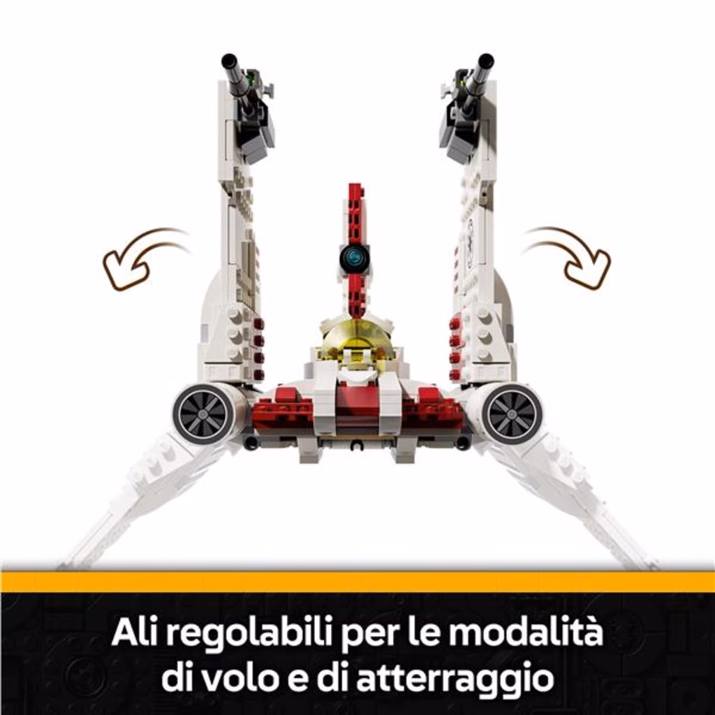 Fai squadra con l eroico personaggio del Generale Obi-Wan Kenobi contro Asajj Ventress e lanciati nell azione LEGO® Star Wars: Le guerre dei cloni con il giocattolo da costruzione del Caccia stellare V-19 Torrent (75432) per bambini. Una fantastica idea regalo Star Wars per bambini, bambine e tutti i fan dai 9 anni in su, lo starfighter è dotato di 2 shooter e ali regolabili per le modalità di volo e atterraggio. L ala centrale può anche essere utilizzata come maniglia per farlo volare .Il playset con velivolo costruibile comprende 3 minifigure LEGO Star Wars, tra cui Asajj Ventress con 2 spade laser rosse con speciale elsa curva e il Generale Obi-Wan Kenobi con una spada laser blu per duelli ricchi di azione.Migliora l esperienza creativa dei bambini con l app LEGO Builder, che consente loro di ingrandire e ruotare una versione digitale 3D dello starfighter Star Wars mentre costruiscono.I veicoli e i personaggi di questo set possono essere utilizzati con altri giocattoli da costruzione LEGO Star Wars (disponibili separatamente) per ulteriori possibilità di gioco di fantasia. Il set contiene 567 pezzi.Caccia stellare LEGO® Star Wars: Le guerre dei cloni: unisciti a un eroico personaggio in emozionanti missioni con questo dettagliato Caccia stellare V-19 Torrent per bambini3 minifigure LEGO® Star Wars : Asajj Ventress con 2 spade laser rosse con elsa ricurva, il generale Obi-Wan Kenobi con una spada laser blu e un pilota clone con una pistola blasterCaccia stellare LEGO® Star Wars in mattoncini: dotato di cabina di pilotaggio apribile, ali regolabili per le modalità di volo e atterraggio e 2 shooter per battaglie di fantasiaPronto per l azione: apri le 3 ali e usa l ala centrale sotto il caccia stellare come maniglia per farlo volare Idea regalo LEGO® Star Wars per bambini, bambine e tutti i fan dai 9 anni in su: regala questo set di gioco con astronave costruibile di alta qualità ai bambini e a tutti i fan di Star Wars: Le guerre dei cloniUn modo divertente di costruire: l app LEGO® Builder guida i bambini in un avventura di costruzione intuitiva, in cui potranno ruotare una versione digitale 3D dei loro modelli da costruzione mentre costruiscono, e altro ancoraEsplora tutto l assortimento: i set LEGO® Star Wars (disponibili separatamente) consentono ai bambini e ai fan adulti di Star Wars di rivivere le classiche scene, creare nuove storie o semplicemente esporre i modelliCostruisci, gioca ed esponi: Il velivolo LEGO® Star Wars di questo playset costruibile di 567 pezzi misura 15 cm di altezza, 20 cm di lunghezza e 14 cm di larghezza