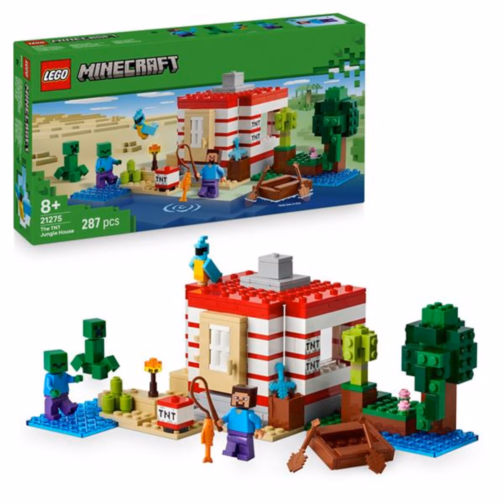 La casa costruibile è ambientata nel bioma della giungla di Minecraft e ha l aspetto di una versione in grande scala dell iconico elemento dinamite del gioco. Un interruttore laterale consente ai bambini di attivare la funzione della dinamite esplodente, che fa crollare l intera casa. Quando le acque si calmano, i bambini potranno ricostruire la casa in modo che sia pronta per la loro nuova avventura. Le minifigure di Steve, del Creeper e dello zombie ispirano il gioco di fantasia e azioni di battaglia. Gli autentici accessori LEGO Minecraft includono una barca, una canna da pesca, un pesce, un pappagallo e il fogliame della giungla. L app LEGO® Builder offre ai bambiniil divertimento aggiuntivo di utilizzare il proprio dispositivo per ingrandire e ruotare i modelli in 3D. Contiene 287 pezzi. La casa giocattolo completa misura 10 cm di altezza, 24 cm di larghezza e 17 cm di profondità.
