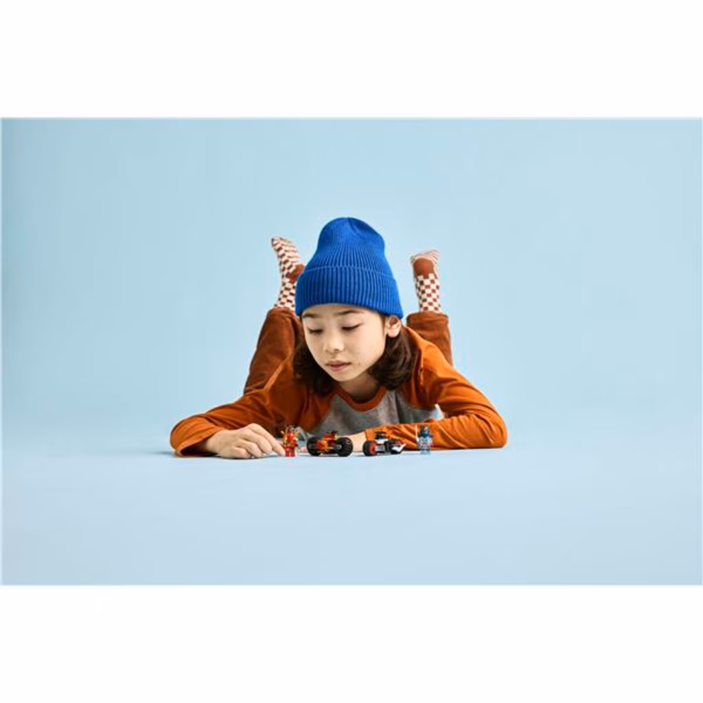 Il set di gioco Gara di velocità sulla moto di Kai (71838) consente ai bambini e alle bambine dai 6 anni in su di ricreare le scene frenetiche della stagione 3 del programma televisivo NINJAGO® La rivolta dei draghi. Il set della battaglia tra motociclette ricco di azione contiene 2 moto ninja con ruote mobili: la moto da corsa di Kai adornata con 2 pugnali e la moto demoniaca del malvagio Scout dragoniano spettrale.