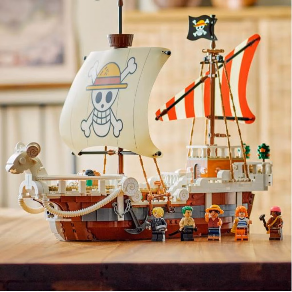 L iconica nave è dotata di diversi spazi interni: una cabina per l equipaggio, una cucina, un magazzino e un officina per gli accessori. Il modello contiene 5 minifigure LEGO ONE PIECE. Luffy siede sulla polena della pecora nella parte anteriore della nave, sotto la quale si trova un cannone; Zoro si rilassa e si allena sul ponte; Nami controlla il timone nella parte posteriore, dove sul ponte crescono i suoi alberi di mandarino preferiti; Usopp si arrampica sugli alberi e fa la guardia dalla coffa; Sanji porta le pentole giù per le scale fino alla cucina. Include 4 poster Ricercato . L app LEGO Builder permette ai bambini di ingrandire, ruotare i modelli in 3D e seguire i progressi.