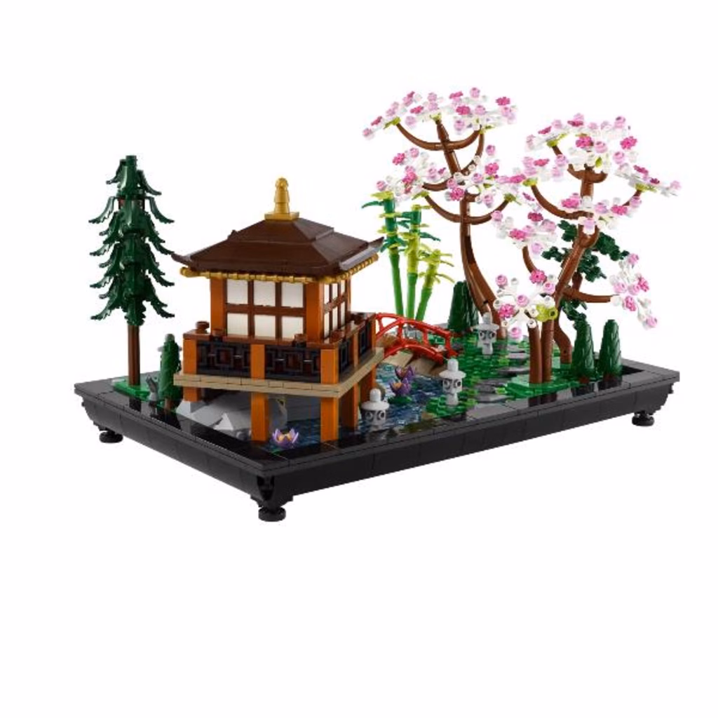 Basato su un tradizionale giardino giapponese, questo modello costruibile comprende un ponte ad arco, un ruscello, carpe koi, fiori di loto, alberi, rocce, lanterne di pietra e un padiglione con una dettagliata sala per la cerimonia del tè.