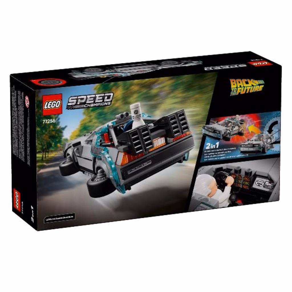 Il kit del modello di auto Macchina del tempo di Ritorno al futuro LEGO® Speed Champions (77256) consente ai bambini dai 9 anni in su di costruire, esporre e ricreare l azione dell iconico franchise cinematografico. Quest'auto giocattolo in mattoncini include molti dei famosi dettagli del modello dei film popolari. Costruisci questa iconica auto con il parafulmine e la targa californiana del primo film e quindi ricostruiscila nella sua versione volante del secondo film con Mr. Fusion, una targa arancione e ruote oblique. Entrambe le versioni sono dotate di prese d aria posteriori, cockpit, condensatore di flusso e calcolatore temporale. Per tanto valore di gioco in più, il playset include anche 2 minifigure dei film: Doc Brown e Marty McFly da posizionare al volante. Un regalo fantastico per bambini e adulti nostalgici, che potranno costruire ogni set di gioco con confidenza utilizzando l'app LEGO Builder, che consente loro di ingrandire, ruotare in 3D e monitorare i progressi con istruzioni digitali facili da seguire.
