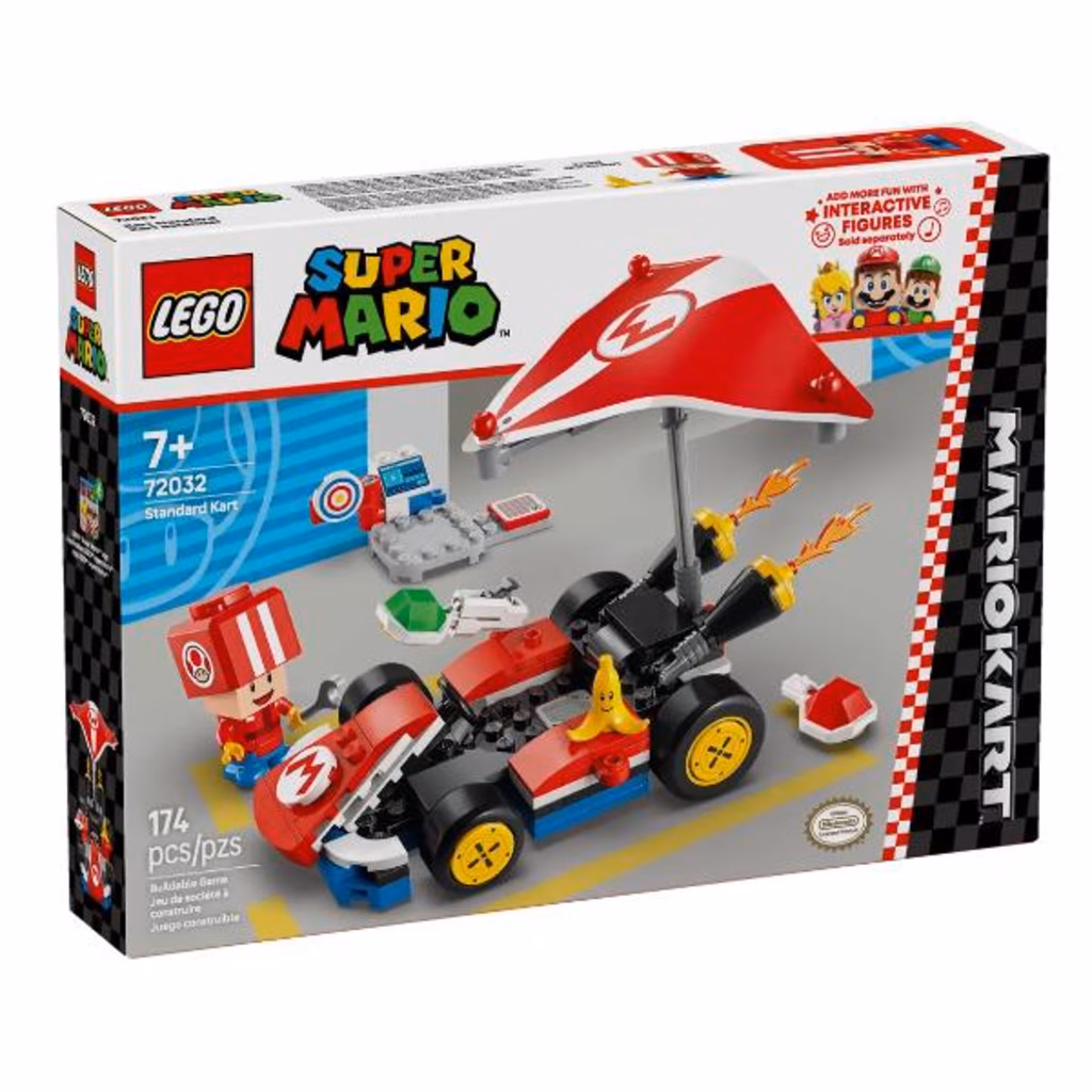 Preparati a gareggiare, derapare e volare sul Kart standard con questo playset per bambini (72032). Un entusiasmante idea regalo LEGO® Super Mario per il compleanno di bambini, bambine e gamer dai 7 anni in su, il set include un modello costruibile del Kart standard di Mario Kart , una postazione di lavoro con un bersaglio e un personaggio giocattolo di Toad (pit stop) in tuta rossa da meccanico. Il Kart standard è dotato di un Superplani staccabile, ruote da drifting e una funzione di lancio per sparare gusci contro il bersaglio nella postazione di lavoro.