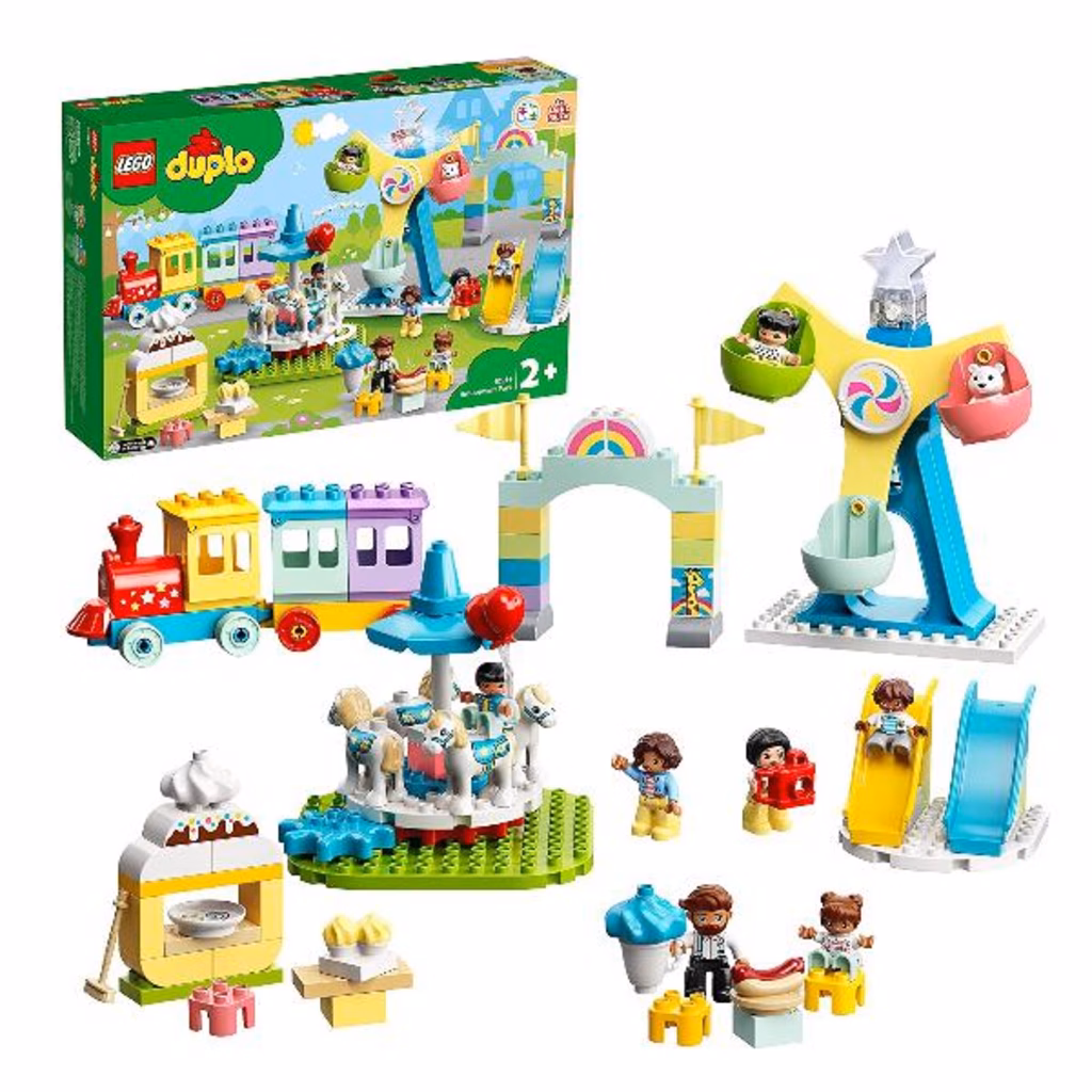 Include 7 personaggi DUPLO® (2 donne, 1 uomo e 4 bambini), 2 scivoli, una giostra meccanica, una ruota panoramica che gira con 3 cabine colorate, un treno a spinta e tanti divertenti accessori.