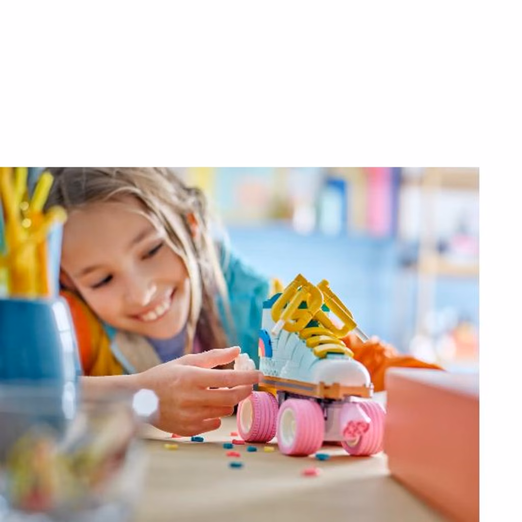 Il set contiene un pattino a rotelle LEGO giocattolo con 4 ruote rosa mobili, freno rosa, spessi lacci gialli e pezzi colorati con cui i bambini possono decorare il tacco dello stivale, realizzando i propri design.