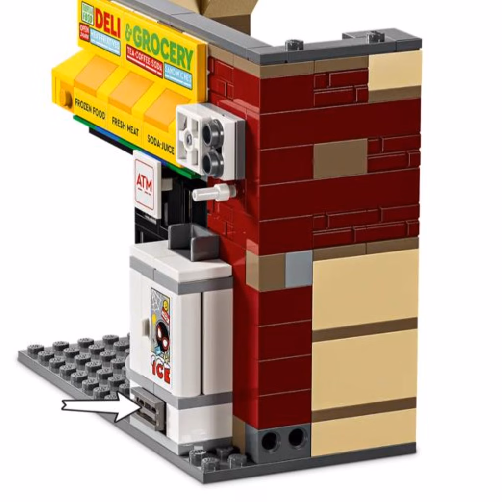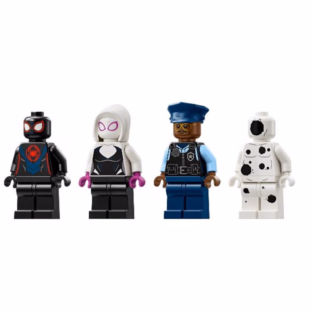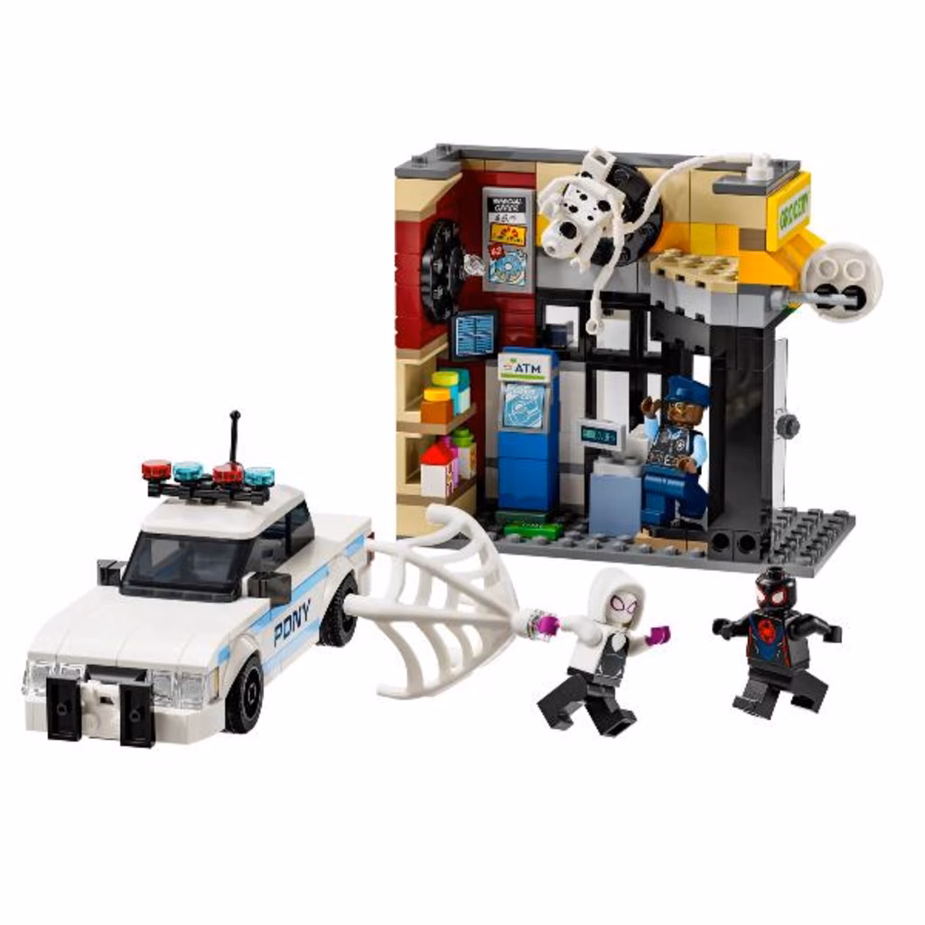 Il set di gioco di Spider-Man include 4 minifigure: Miles Morales, la Macchia, Gwen Stacy e l agente Jefferson. Il minimarket è dotato di un muro esplodente che consente di rimuovere il bancomat. Gli accessori includono una corda di rete lunga e flessibile e una ragnatela flessibile abbastanza grande da racchiudere una minifigure. L auto della polizia si apre per consentire il posizionamento di 2 minifigure al suo interno. Per tanto divertimento digitale in più, i costruttori possono ingrandire, ruotare i modelli in 3D e monitorare i loro progressi utilizzando la divertente e intuitiva app LEGO Builder.