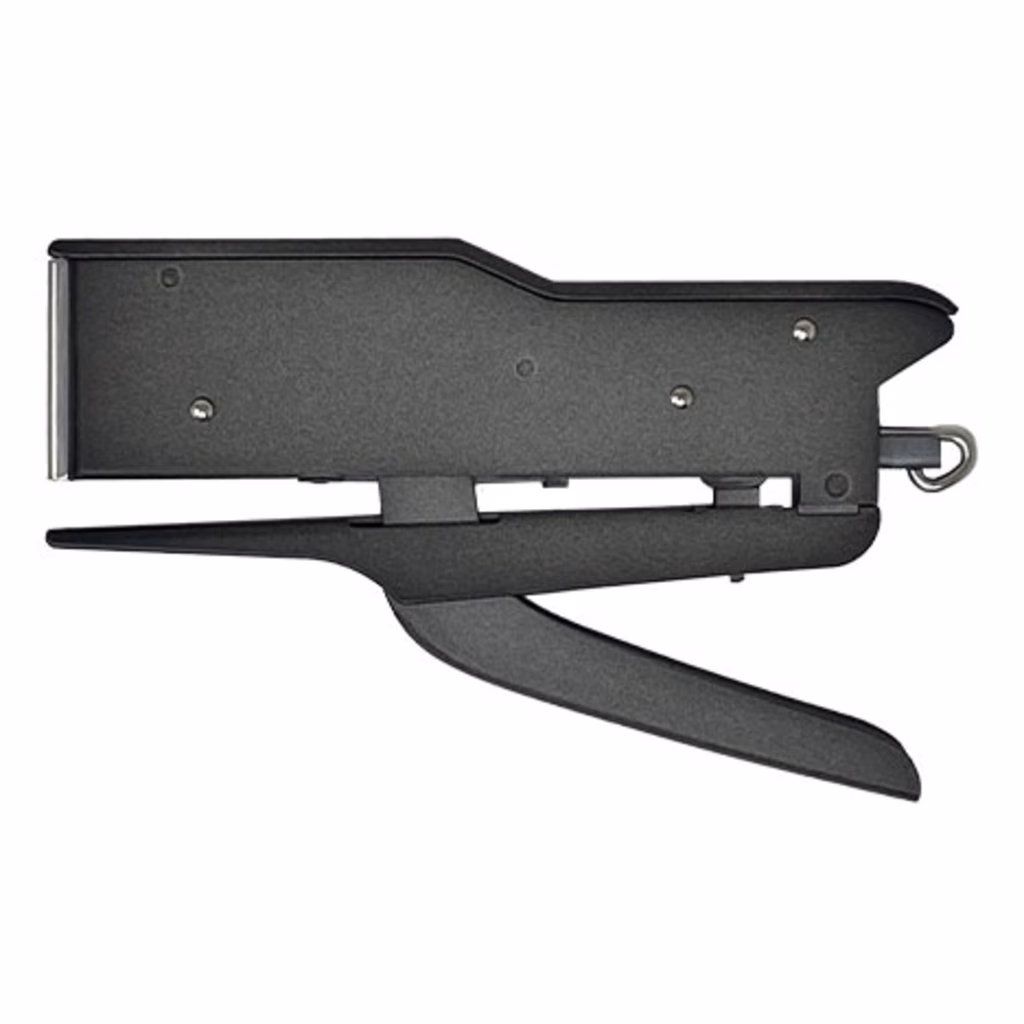 Cucitrice a pinza Zenith con colorazione nero jeans, interamente in metallo verniciato con smalti senza piombo, dotata di dispositivo anti inceppamento, doppio spessore cucitura mm 4 e mm 6, capacità 100 punti, garanzia a vita
