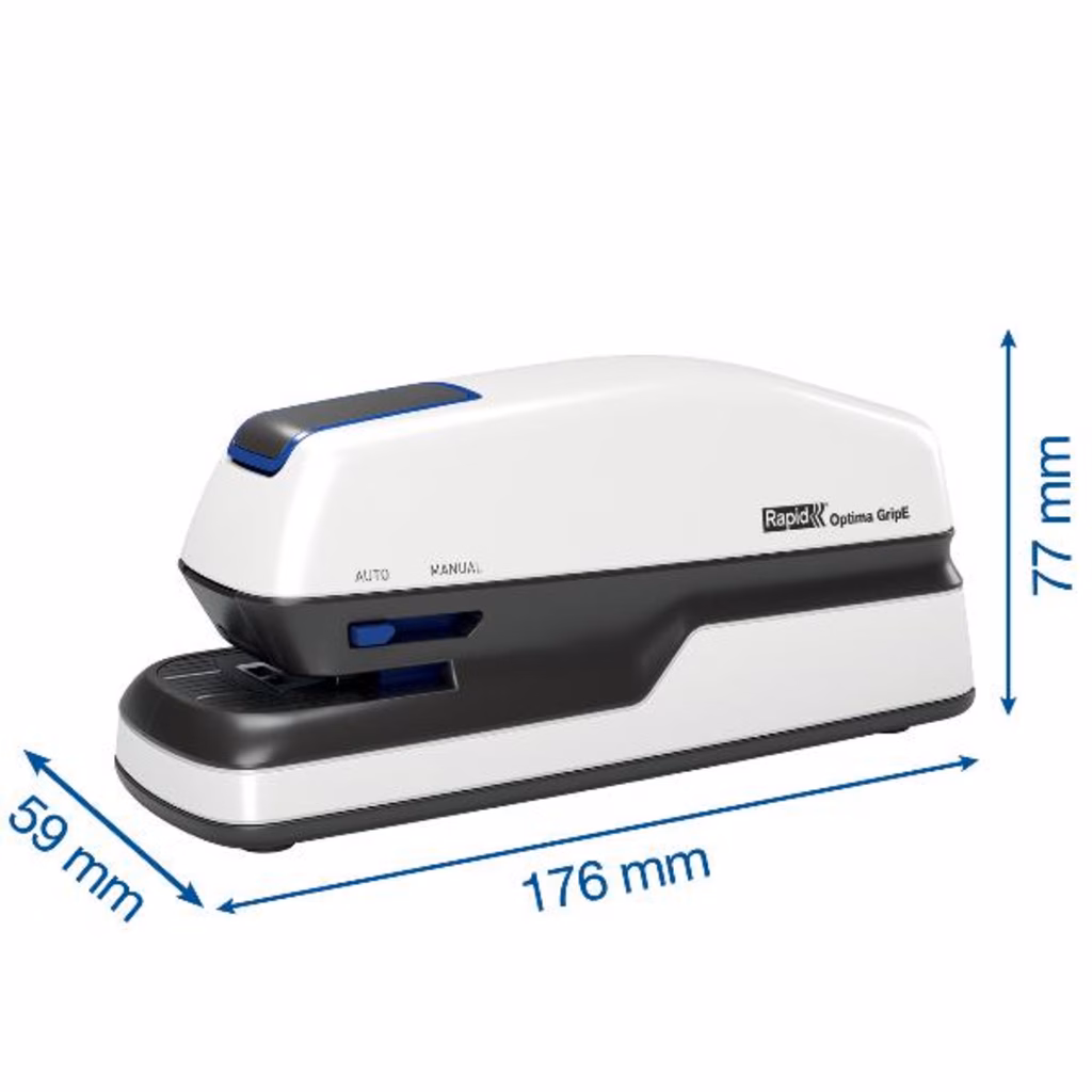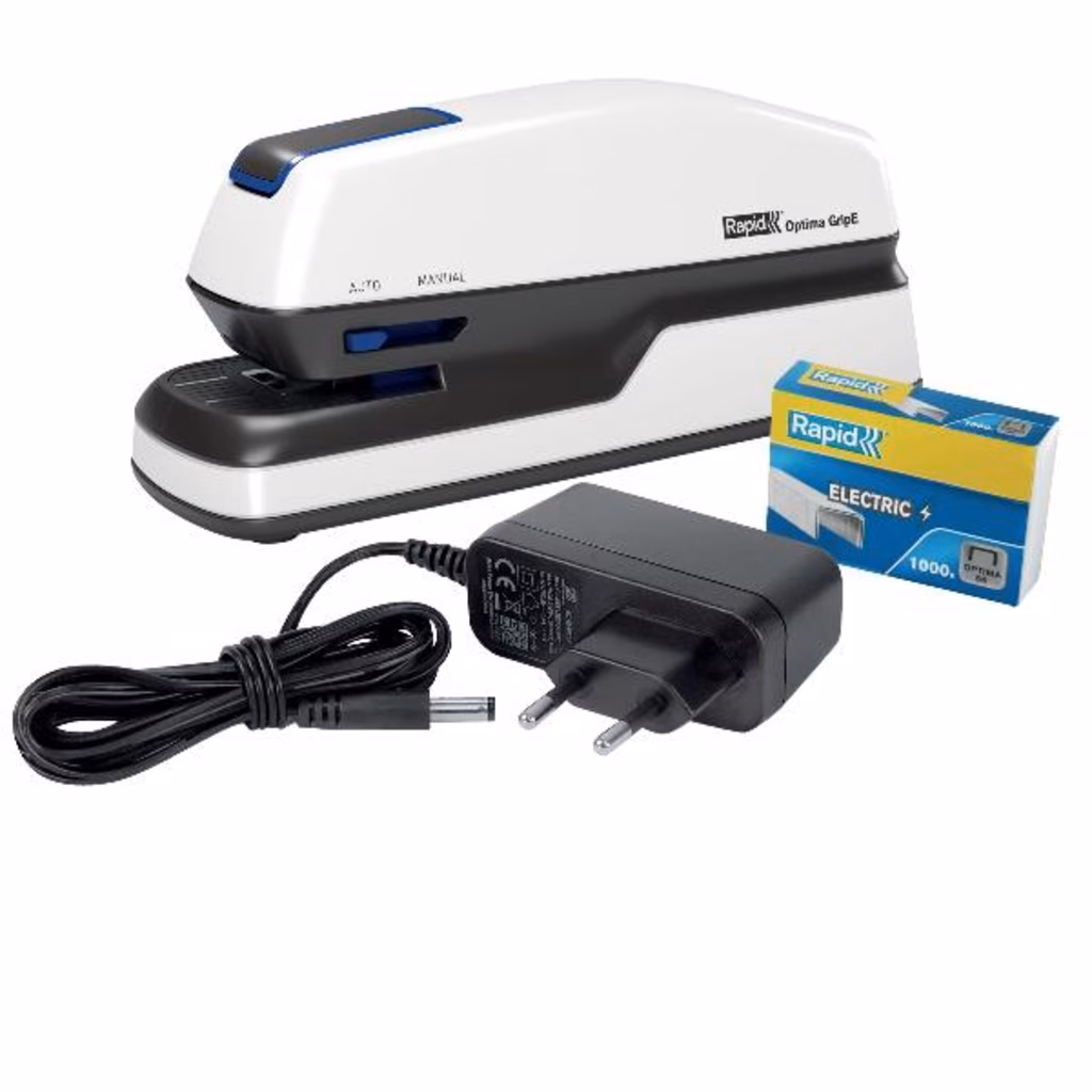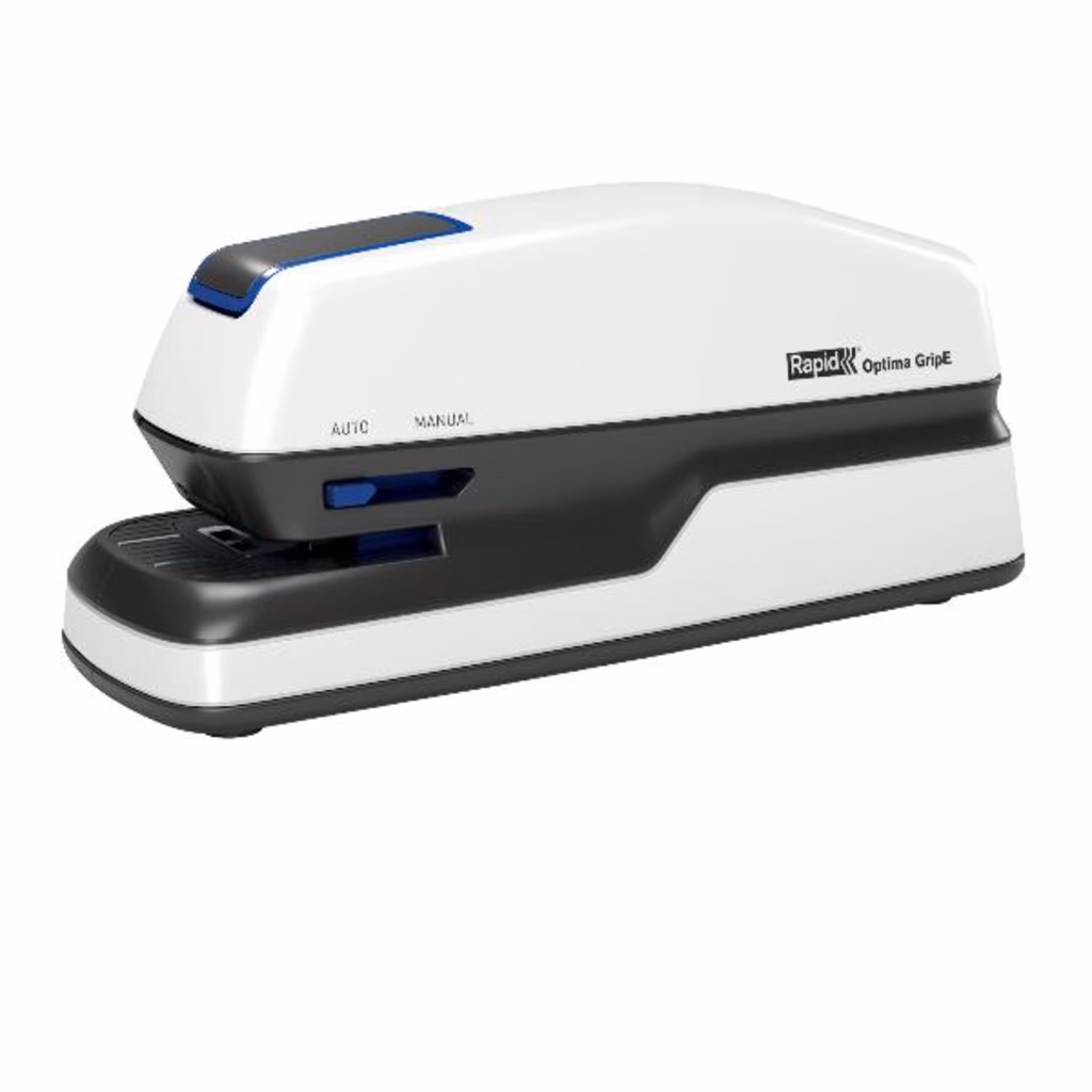 La cucitrice elettrica Rapid GripE consente di pinzare senza fatica fino a 20 fogli di carta alla volta (80 g/m²), risparmiando tempo a casa o al lavoro. Può essere controllata manualmente (premendo il cappuccio anteriore) o completamente automatica, in quanto la cucitrice rileva l'inserimento della carta. Con le sue dimensioni compatte per l'uso da tavolo o a mano, questa cucitrice automatica posiziona con precisione i punti sulla carta utilizzando la guida di posizionamento dei punti e garantisce una pinzatura senza inceppamenti. Ideale per l'uso in ufficio, nelle aree di ricevimento, nelle casse o a casa. Pinzatura igienica grazie all'utilizzo senza contatto. Alimentazione doppia tramite adattatore di rete (incluso) o 4x batterie AA (non incluse). Fornito con una scatola di 1000 punti Optima 56.