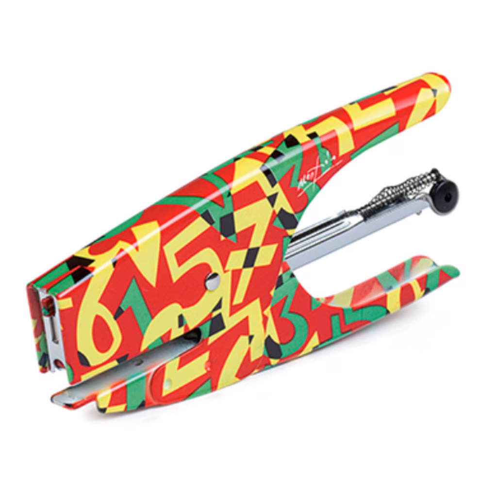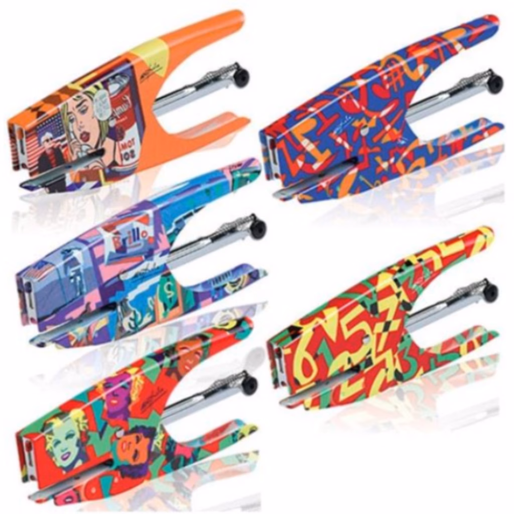 Cucitrici manuali a pinza passo 6, versione punto chiuso .Realizzate interamente in acciaio cromato e rivestite con una particolare tecnica di finitura.Preziose, divertenti, coloratissime con i loro evidenti richiami alla Pop Art, le cinque cucitrici della nuova Pop Office Collection sono firmate da Ugo Nespolo, uno dei più grandi artisti italiani contemporanei.