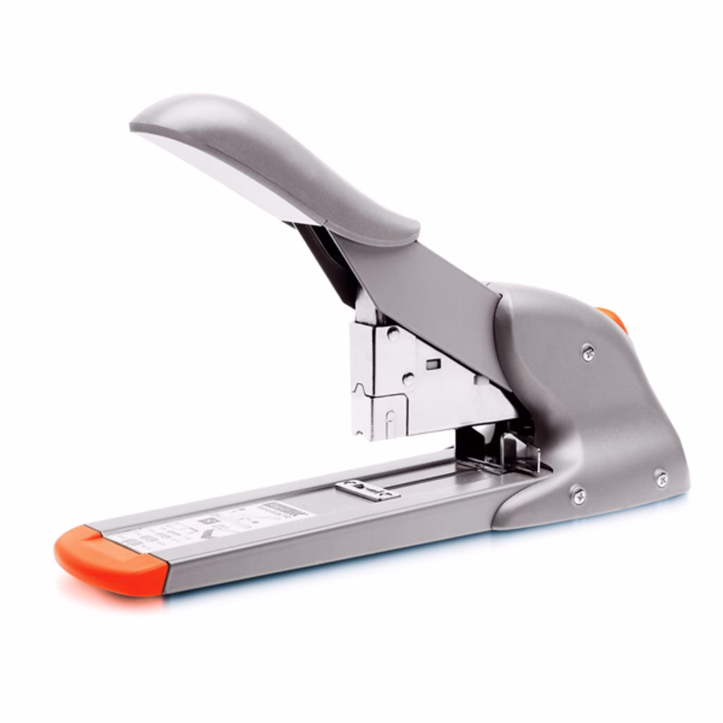 Cucitrice per alti spessori con telaio in acciaio - velocissimo sistema di avancarica con fenditure laterali per la visualizzazione del punto usato e con apertura tramite pulsante rosso - regolatore di profondità inserimento fogli - meccanismo antinceppamento - robusta base in acciaio su piedini di gomma per la massima stabilità nella cucitura - utilizza punti serie 23 (da 23/8 a 23/15) e serie 9 (da 9/8 a 9/15)