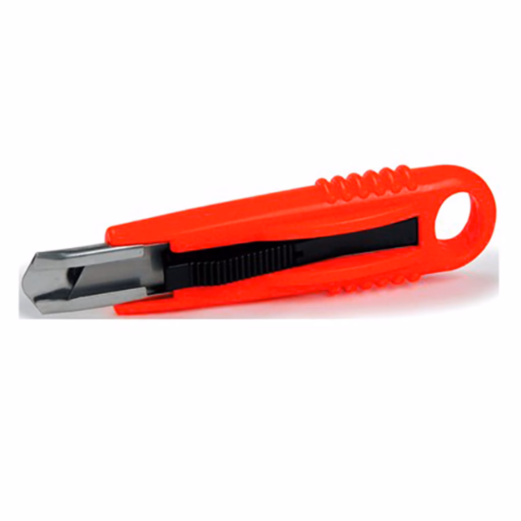 Cutter con lama trapezioidale a rientro automatico. Sistema di ritrazione a molla conforme alle norme europee di antinfortunistica: il sistema di ritrazione a molla provoca l'immediato rientro della lama all'interno dell'impugnatura quando viene a mancare il contatto tra la lama ed il materiale. Sistema di sicurezza contro possibili incidenti.