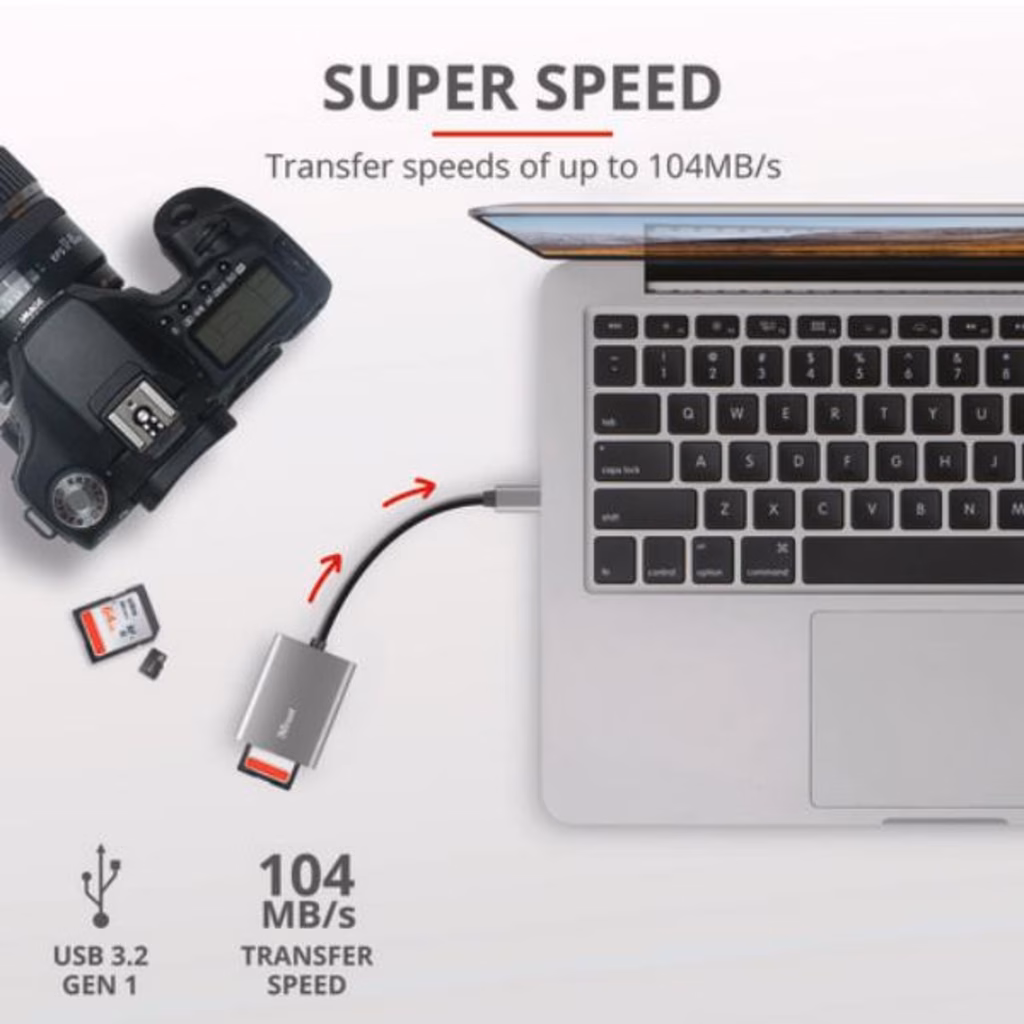 Una vita al massimoGrazie alle schede compatibili UHS-I, puoi sfruttare una connessione veloce USB-C 3.2 per copiare i dati fino a una velocità di trasferimento di 104 MB/s.