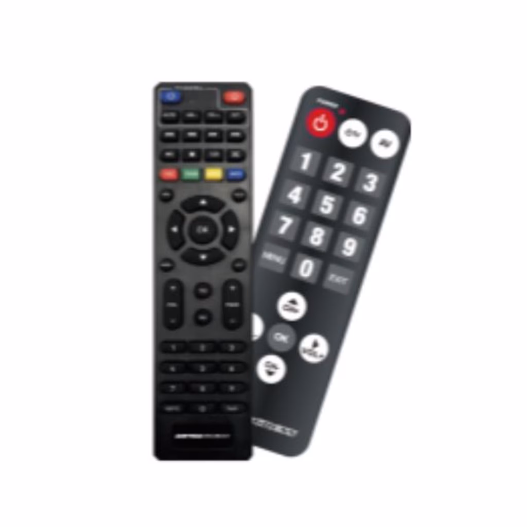 Il doppio telecomando incluso permette il controllo del decoder nelle sue funzioni principali, nonchè il controllo del televisore nelle funzioni di accensione/spegnimento TV e di selezione ingresso AV.