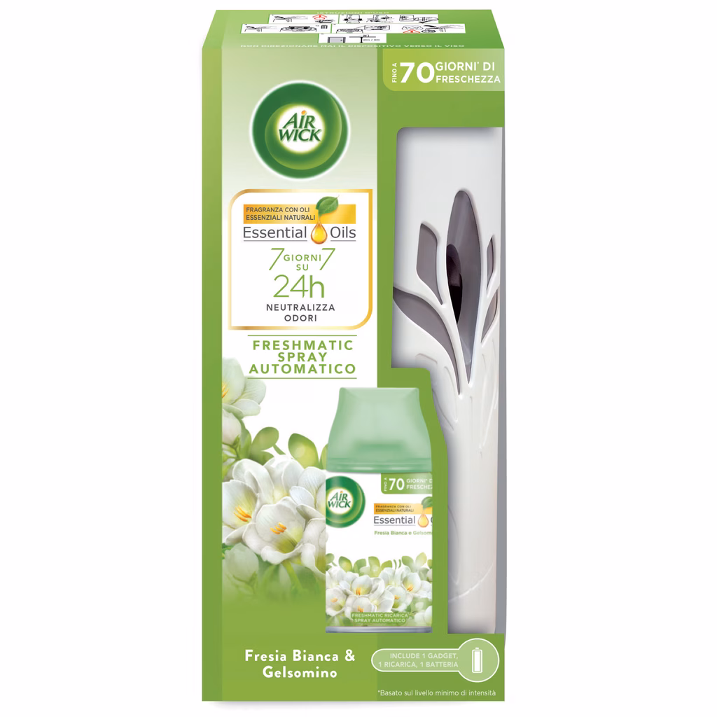 Deodorante per ambienti Air Wick Freshmatic completo di ricarica alla fresia bianca e gelsomino - Facile da usare: basta inserire la ricarica Airwick nel dispositivo Freshmatic e il dispositivo, alimentato a batteria, rilascia profumi freschi e leggeri a intervalli di tempo prestabiliti (9, 18 o 36 minuti). In questo modo i cattivi odori vengono neutralizzati e l'ambiente resta sempre profumato. Fino a 70 giorni per ricarica.