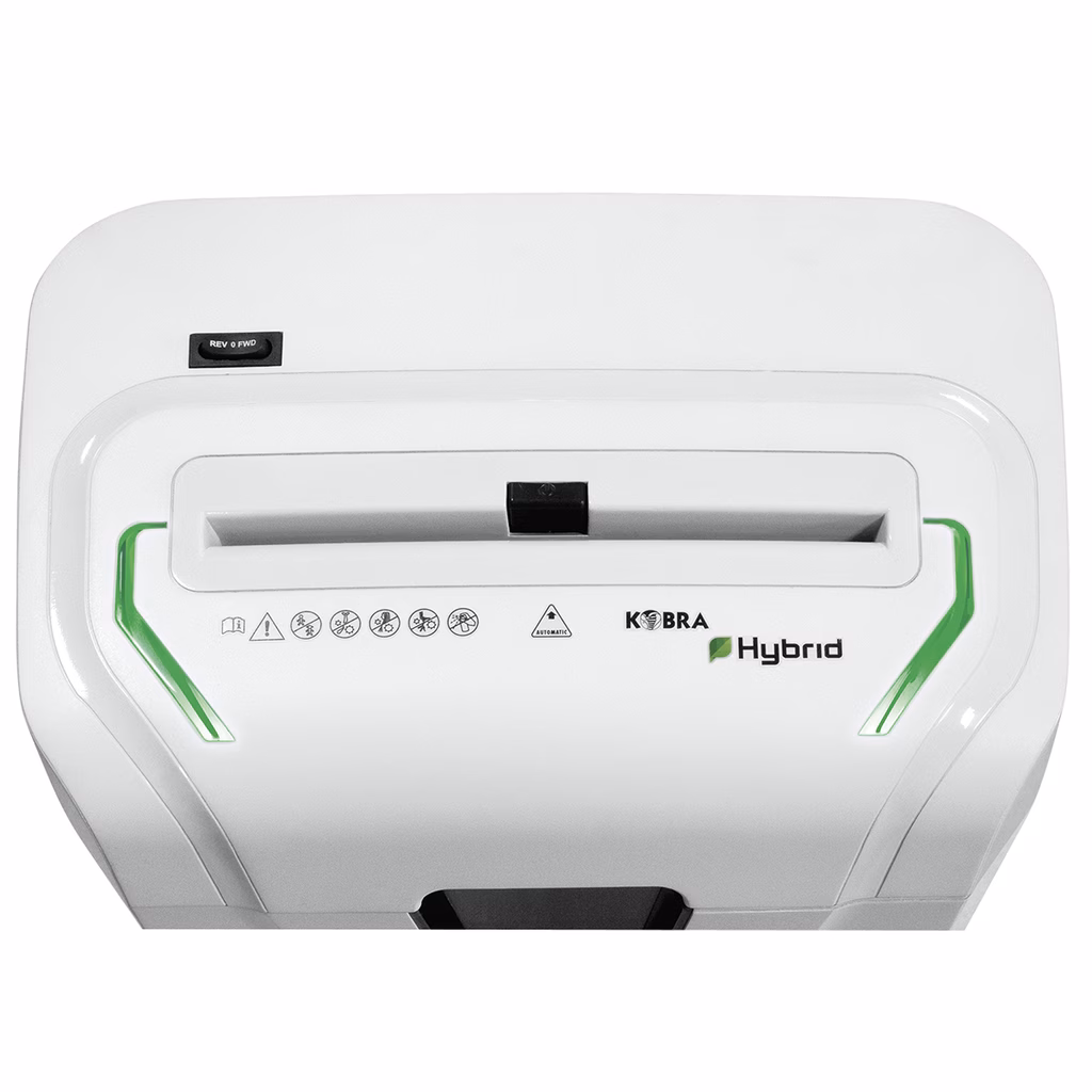 Kobra Hybrid è un innovativo distruttore a frammenti equipaggiato con l'esclusiva tecnologia Hybrid per il risparmio dell'energia. Una tecnologia esclusiva permette il funzionamento tramite l'utilizzo di energia accumulata durante il funzionamento e in seguito il distacco automatico dalla rete a fine distruzione per zero consumi elettrici. Una meccanica affidabile e durevole con motore a funzionamento continuo e coltelli in acciaio (non danneggiabili da punti metallici e graffette) assicurano prestazioni impareggiabili unitamente a un design e tecnologia LED esclusivi.