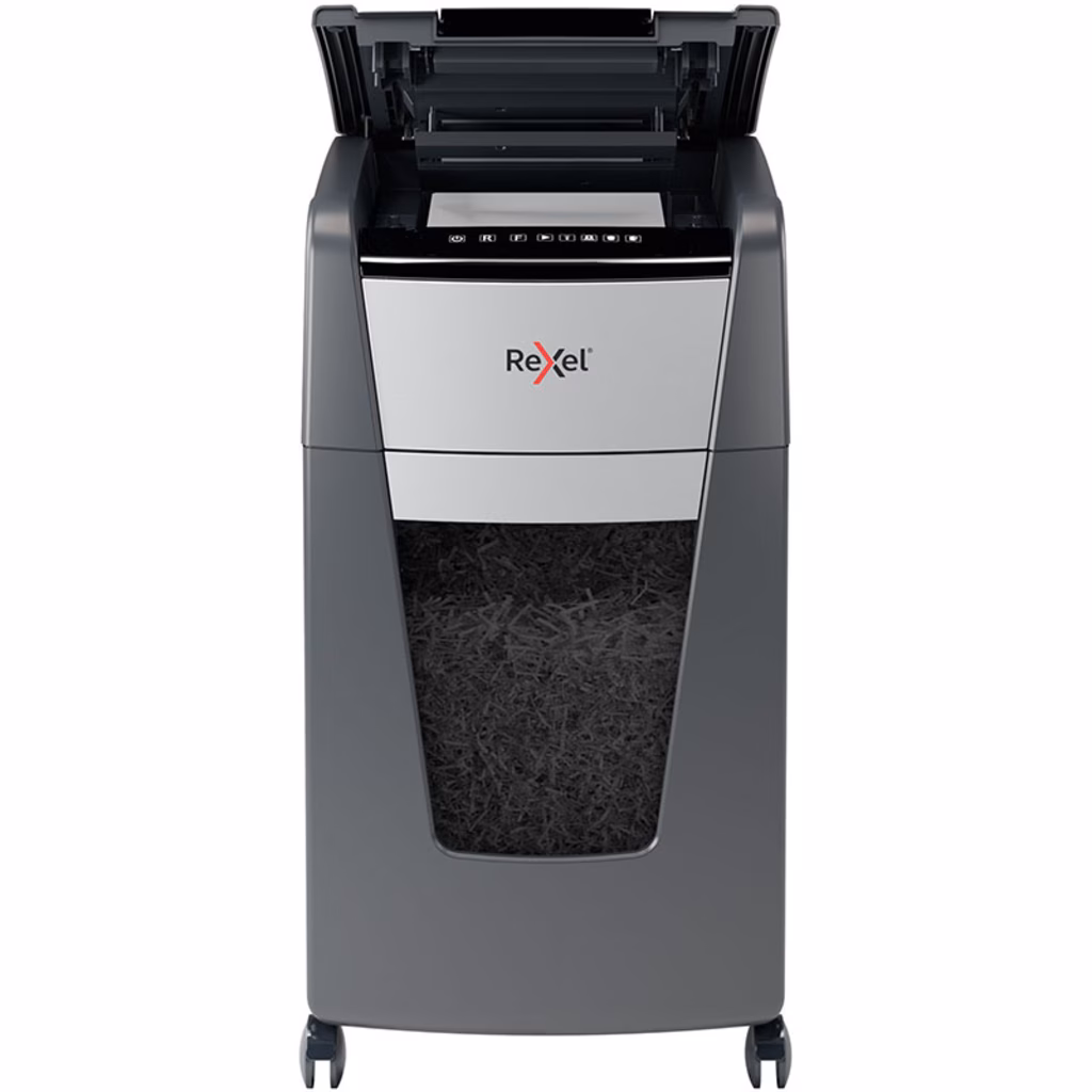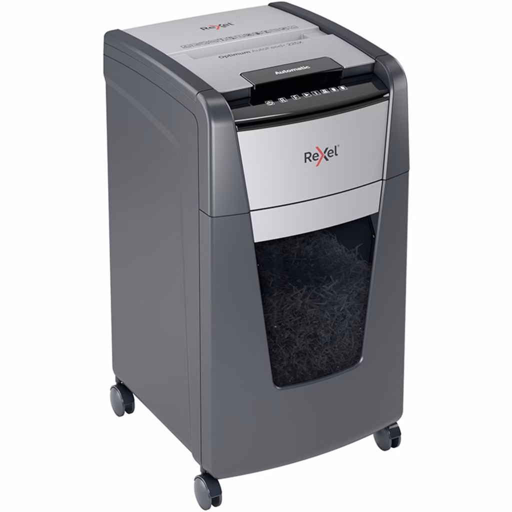 Distruggidocumenti Optimum AutoFeed+ 225X automatico. Distrugge fino a 130 fogli A4 alla volta con sistema automatico. Distruggidocumenti con taglio a frammenti e con livello di sicurezza P-4.