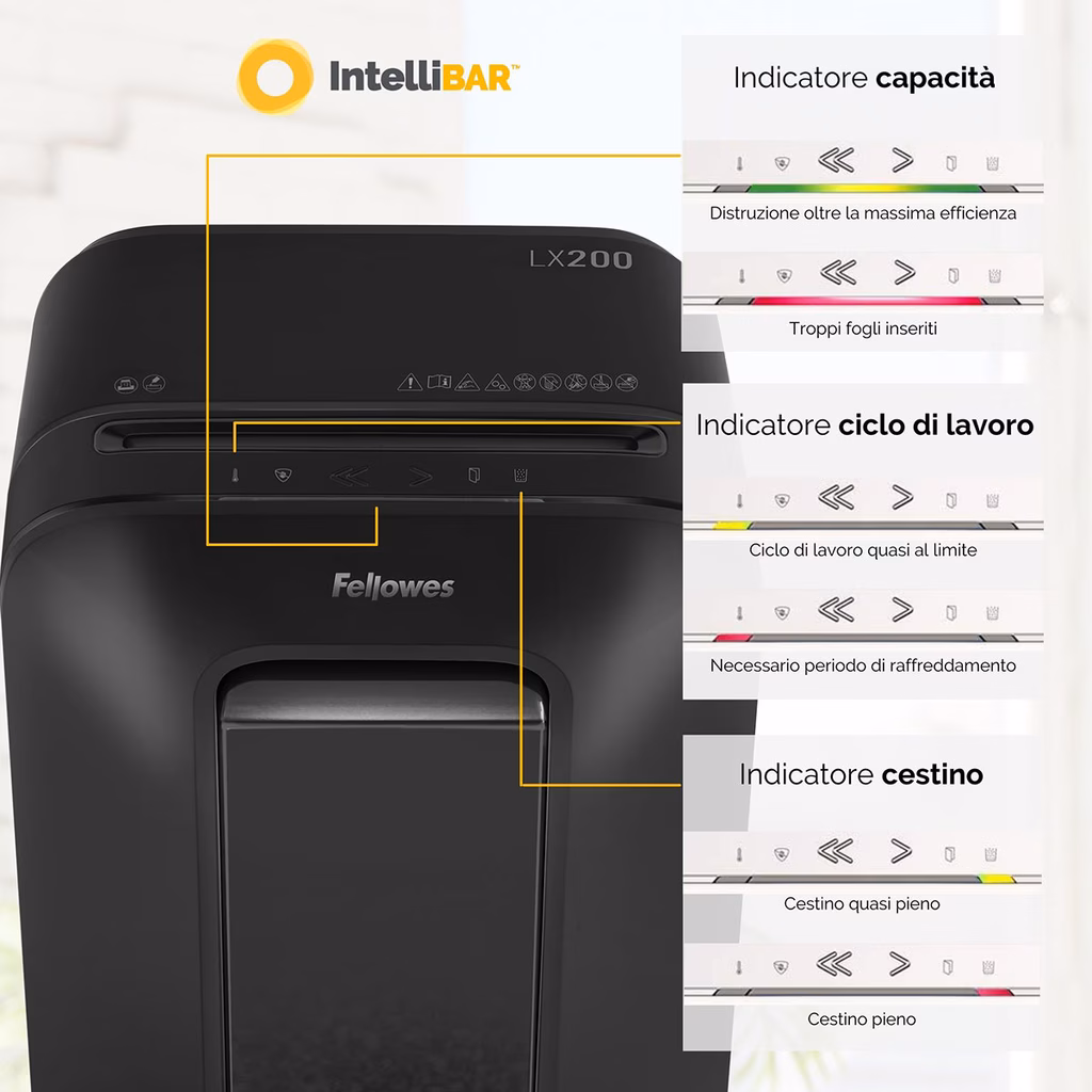 Distruggidocumenti a microframmento P5. Distrugge 12 fogli x volta, ciclo continuo di 10 minuti, cestino da 23 litri. I nuovi dsitruggidocumenti della serie LX hanno un nuovo design moderno unito ad una nuova tecnologia INTELLIBAR che permette di avere il pieno controllo della macchina.