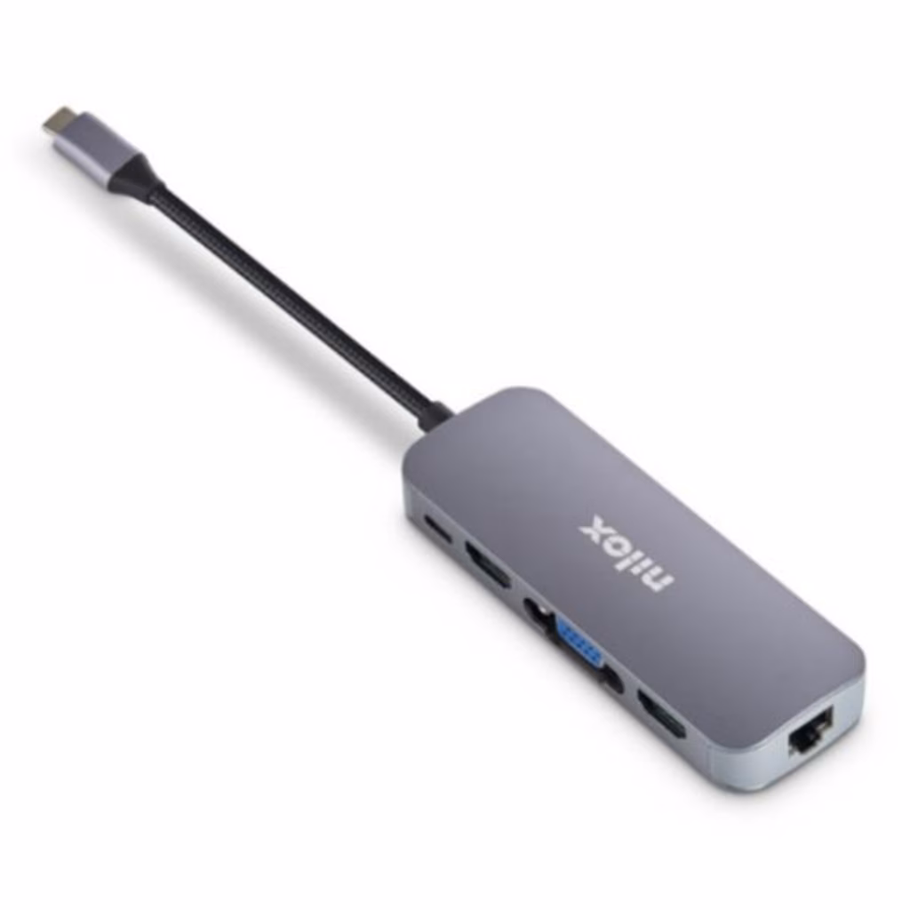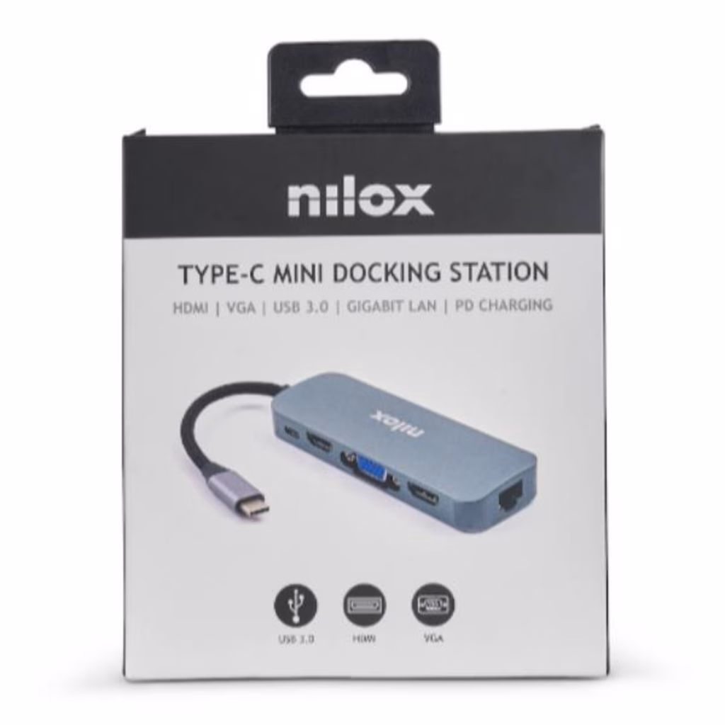 Con questa docking station universale di Nilox non avrai problemi a connettere i tuoi dispositivi. Potrai connettere fino a tre dispositivi USB contemporaneamente grazie alle interfacce USB Type-C, una delle quali dotata di Power Delivery (fino a 87W). Collega i tuoi dispositivi video grazie alle 2 porte HDMI e 1 porta VGA disponibili. 1 porta 1 RJ45 Gigabit ethernet LAN con velocità trasferimento Ethernet LAN: 10,100,1000 Mbit/s.