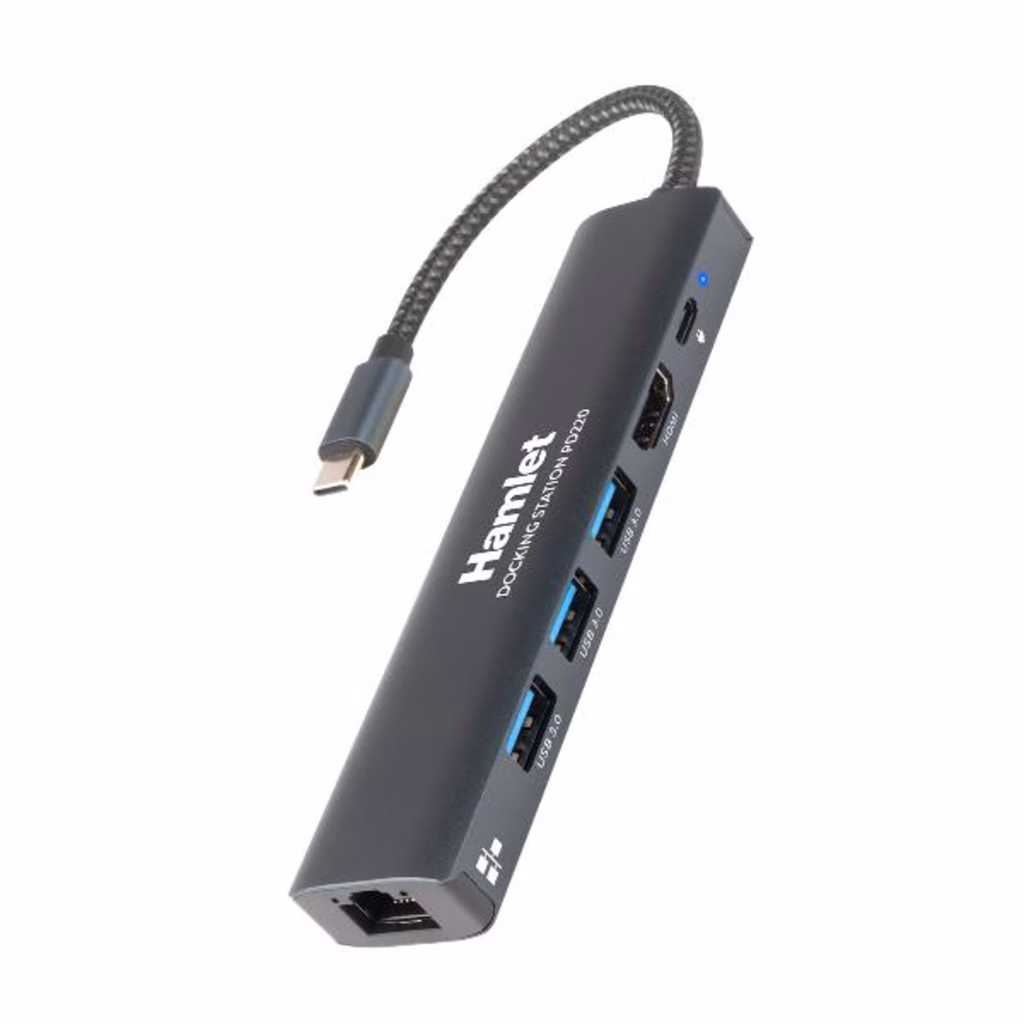 La Docking Station PD220 di Hamlet consente di ampliare l'area di lavoro dello schermo e la connettività del notebook utilizzando un solo cavo USB Type-C. L'uscita video HDMI con supporto 4K Ultra HD permette di collegare un monitor esterno per duplicare o estendere il desktop del computer su uno schermo più grande. Le tre porte USB 3.0 offrono connettività per dispositivi esterni come tastiere, mouse ed hard disk e supportano la ricarica di dispositivi come smartphone e tablet. Completa la connettività della docking station la porta di rete Gigabit per il collegamento alla rete LAN e Internet.