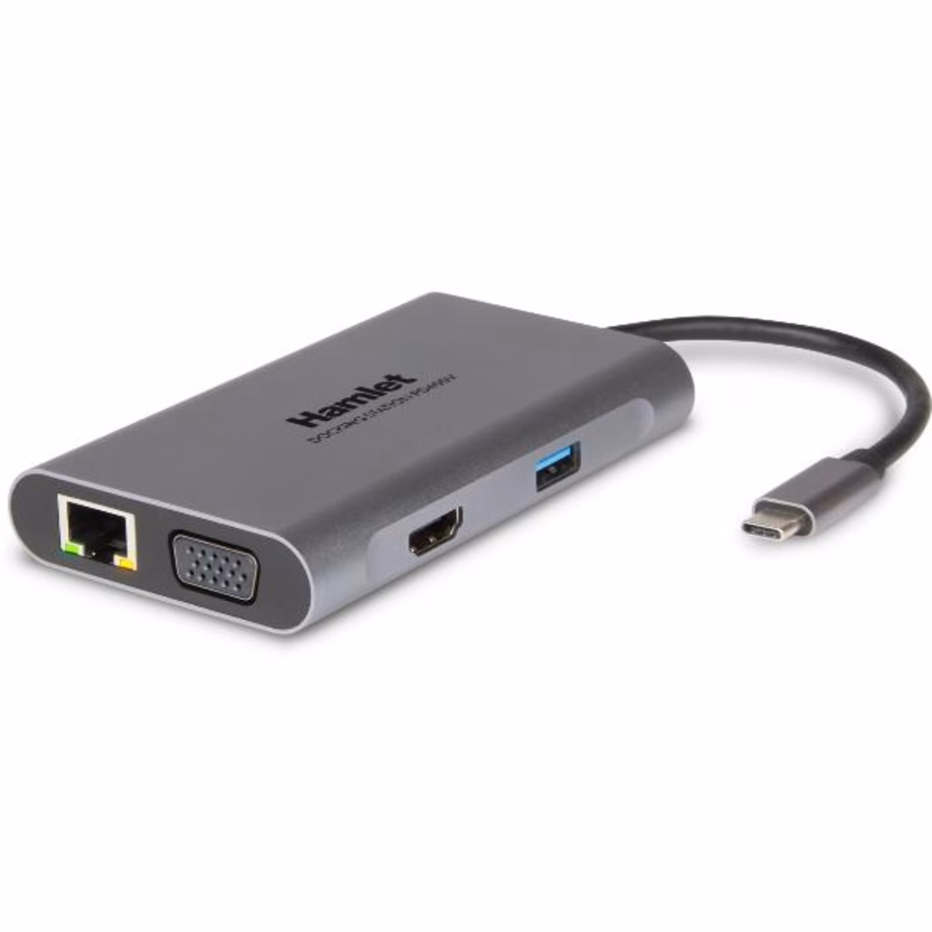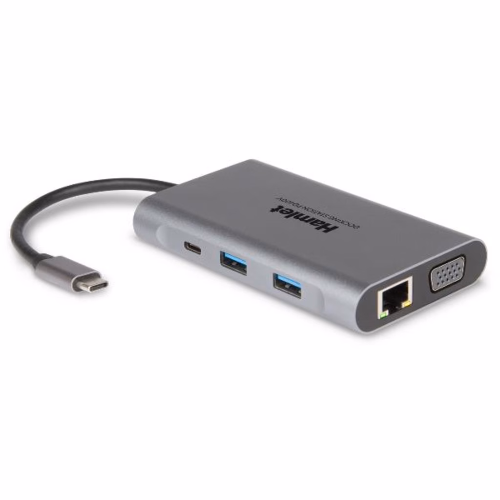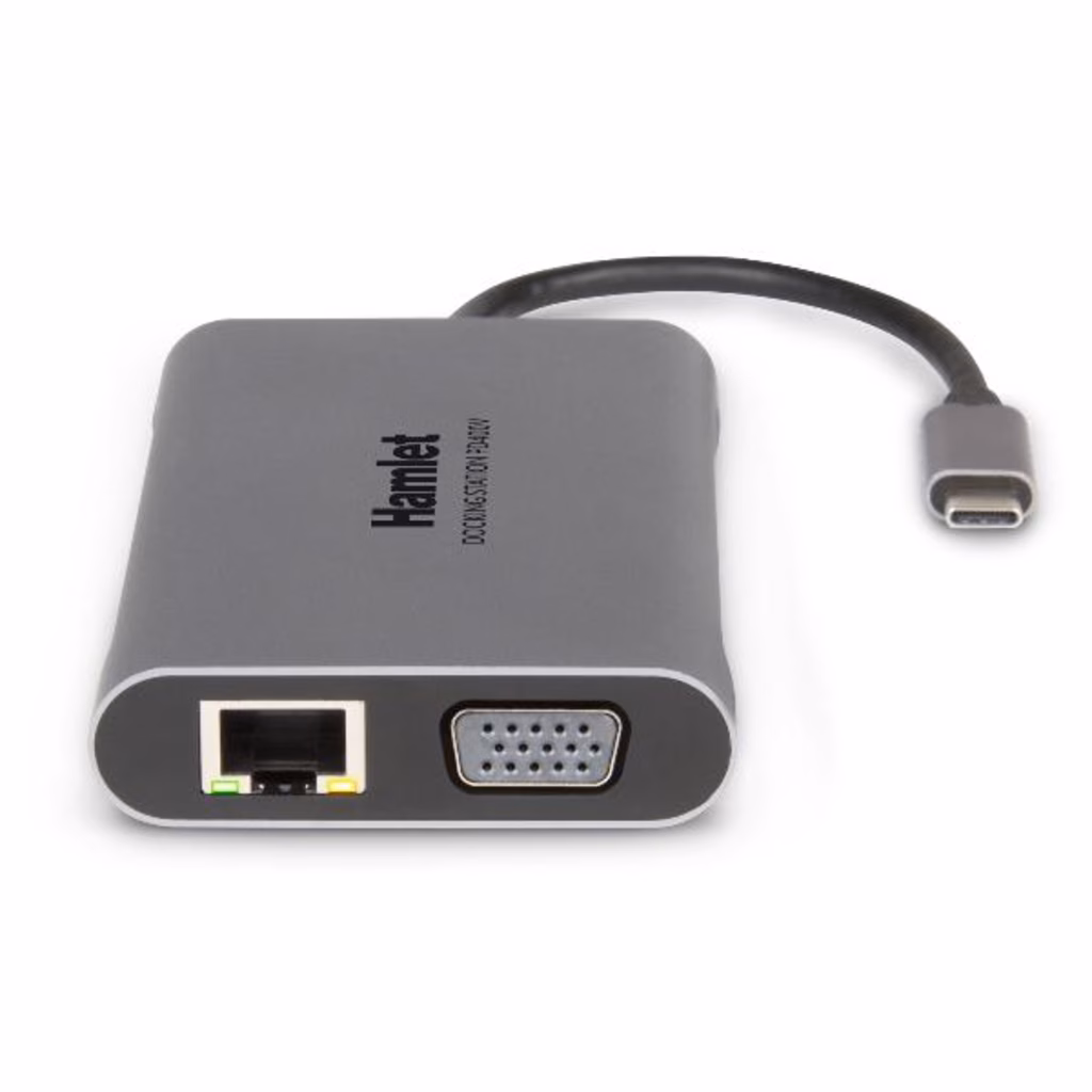 La Docking Station PD400V di Hamlet consente di ampliare l'area di lavoro dello schermo e la connettività del notebook utilizzando un solo cavo USB Type-C. Le due uscite video HDMI e VGA con supporto fino a 4K Ultra HD permettono di collegare due monitor esterni per duplicare o estendere il desktop del computer su schermi più grandi. Le tre porte USB 3.0 offrono connettività per dispositivi esterni come tastiere, mouse ed hard disk e supportano la ricarica di dispositivi come smartphone e tablet. Completa la connettività della docking station la porta di rete Gigabit per il collegamento alla rete LAN e Internet.La porta USB-C della Docking Station PD400V adotta la tecnologia di ricarica Power Delivery 3.0 (PD) che consente di ricaricare il notebook con una potenza totale di 85 Watt.