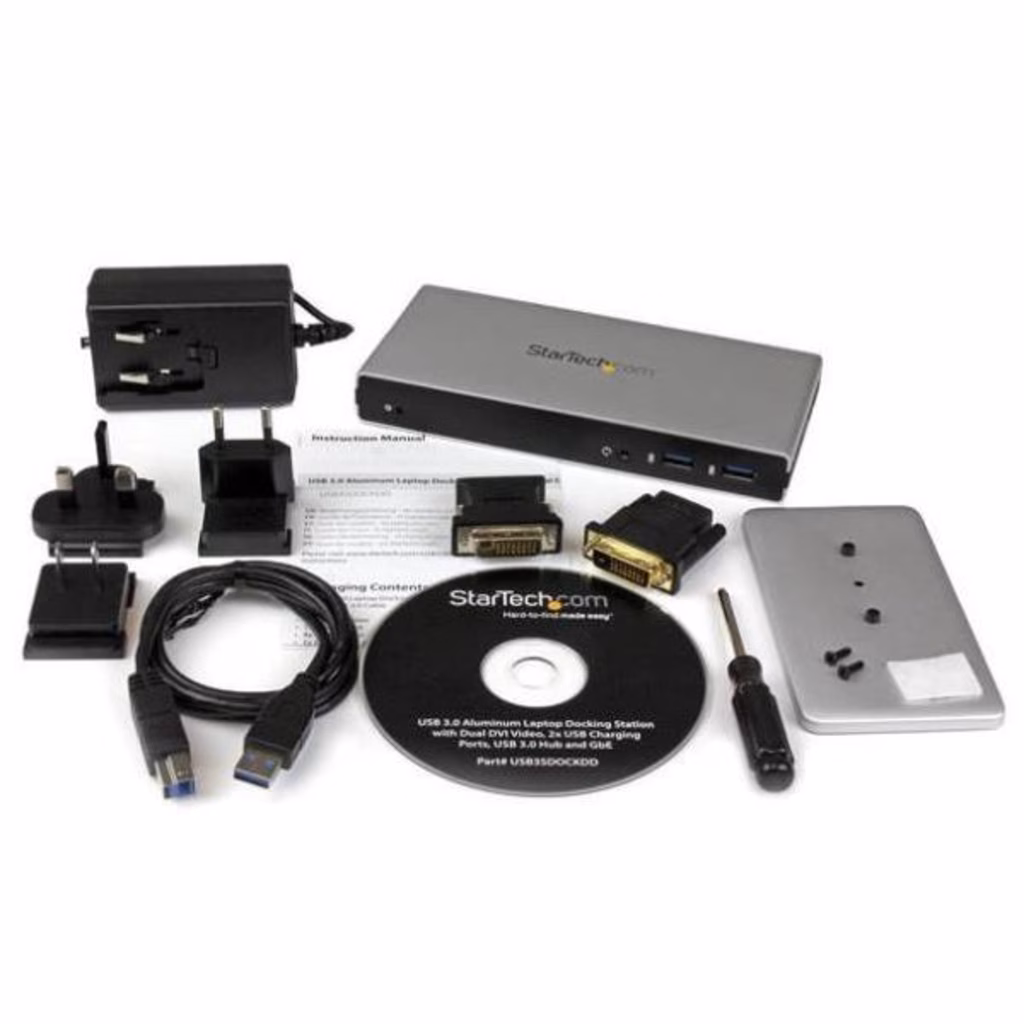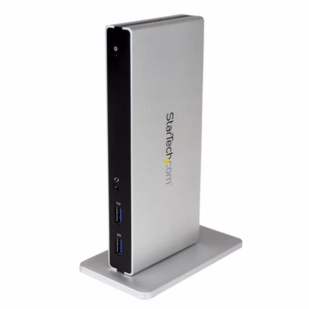 Questa Docking Station Universale per Laptop USB 3.0 a due monitor trasforma il computer laptop in una workstation a due monitor con opzioni di configurazione flessibili.  Scelta flessibile del display Questa docking station con due porte DVI aggiunge il supporto per due monitor alla workstation, permettendo di utilizzare risoluzioni fino a 2048x1152. Con una maggiore quantità di spazio sullo schermo, è possibile accedere a più applicazioni contemporaneamente e consultare il materiale di riferimento su un display mentre si scrive sull'altro. Per consentire alla docking station USB 3.0 di supportare una vasta gamma di display, sono inclusi due adattatori per display (da DVI a VGA e da DVI ad HDMI). Connessioni potenti per la ricarica rapida dei dispositivi Trasforma il computer laptop in una workstation che supporta tutte le periferiche. Questa Docking Station Universale per Laptop USB 3.0 include cinque porte USB 3.0 (USB 3.1 Gen 1). Le due porte USB anteriori sono a ricarica rapida (specifica di ricarica delle batterie USB 1.2). Queste porte comodamente accessibili ricaricano i dispositivi mobili più velocemente delle porte USB standard, anche quando il computer laptop non è inserito nella docking station. La docking station include anche una porta GbE, un jack per cuffie e porte per audio e microfono separate da 3,5 mm, per offrire tutte le connessioni necessarie.  Risparmio di spazio sulla scrivania Il supporto opzionale in dotazione consente di posizionare la docking station in verticale per risparmiare spazio prezioso sulla scrivania.  Il prodotto USB3SDOCKDD è coperto da una garanzia StarTech.com di 3 anni e dal supporto tecnico gratuito a vita.