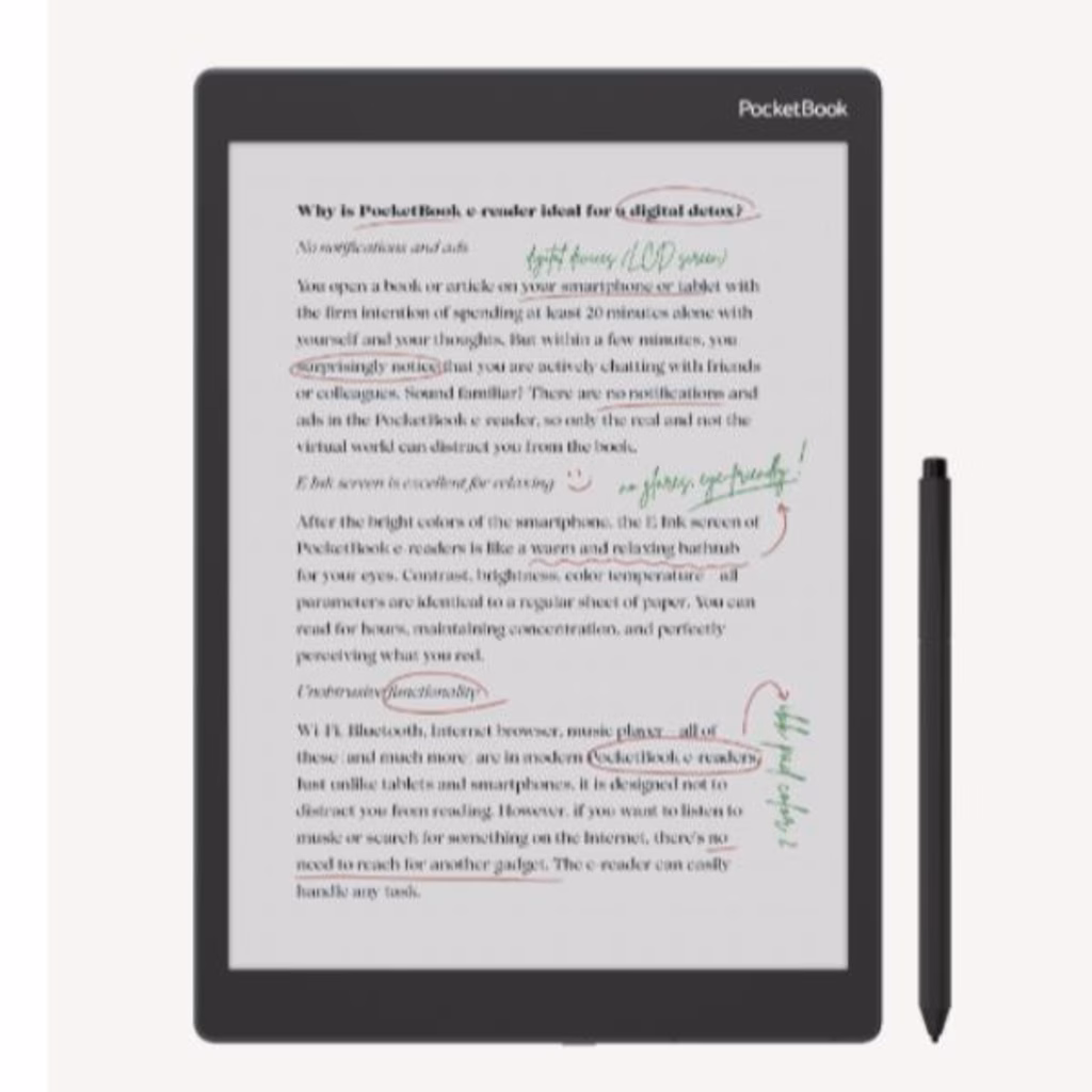Pocketbook Color Note è un device e-note dotato di un fantastico schermo 10,3'' E-ink Kaleido 3, penna stylo ed una gran varietà di tool.