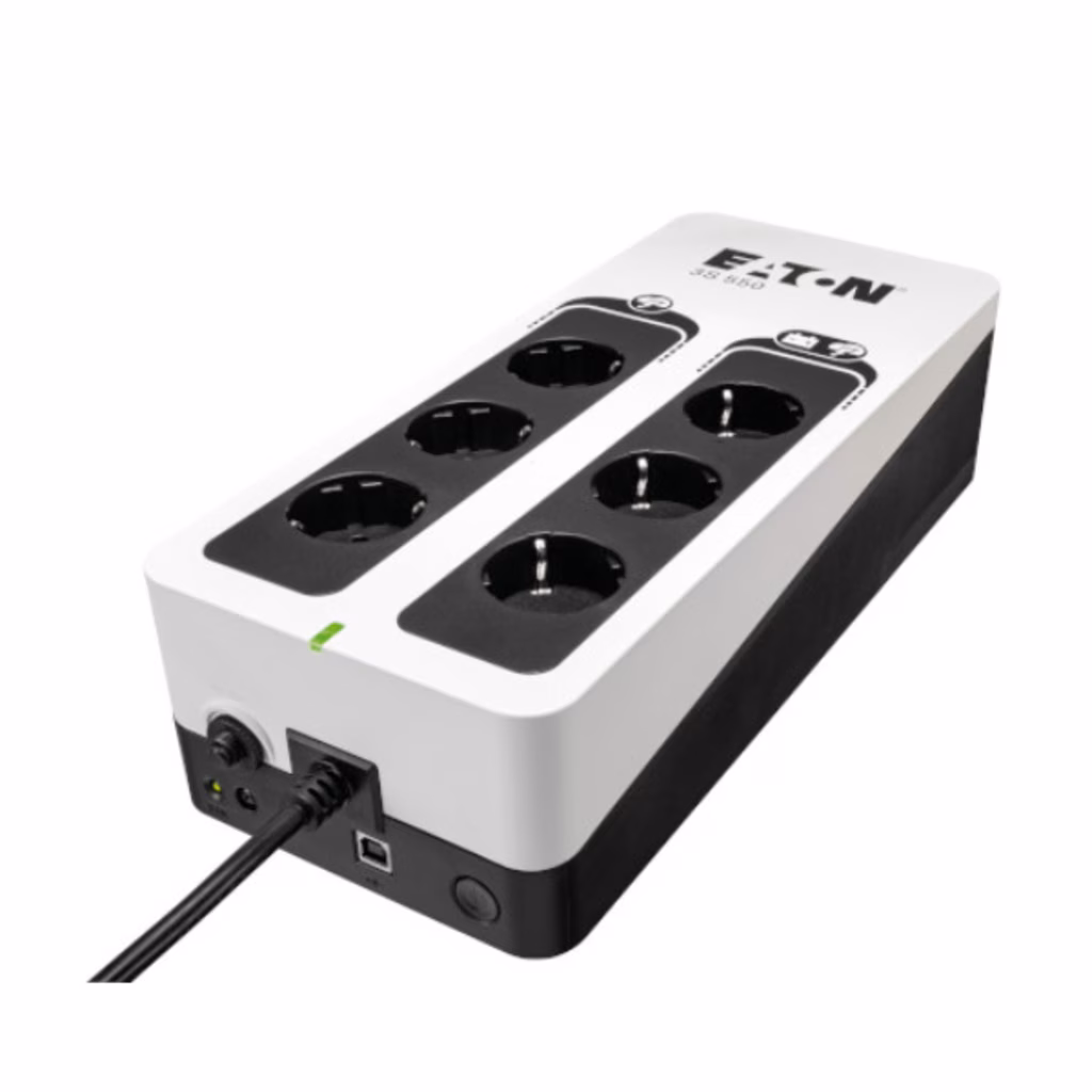 UPS Eaton 3S: Protezione dell'alimentazione per apparecchiature informatiche per ufficio e casaProtezione contro i problemi di alimentazione L'UPS Eaton 3S aiuta a proteggere le tue apparecchiature informatiche in caso di eventi quotidiani come cadute difulmini, temporali, eccesso di domanda sulla rete elettrica, incidenti e calamità naturali che interrompono l'alimentazione elettrica senza preavviso. Nel caso di blackout totale, l'unità fornisce il backup dalla batteria per un tempo sufficiente a superare la maggior parte delle interruzioni di alimentazione. Il modello 3S protegge anche telefoni, connessioni a banda larga e linee Ethernet da sovracorrenti backdoor . Il software di spegnimento consente di salvare automaticamente il lavoro e chiudere l'applicazione senza perdere dati.Una volta ripristinata l'alimentazione, potrai continuare a lavorare dal punto in cui vi siete interrotti.Facile integrazione e installazione Il design elegante e la finitura lucida rendono il modello 3S perfetto per ogni ambiente d'ufficio moderno. Il modello 3S viene fornito con 6 prese Schuko (DIN) Il modello 3S è dotato anche di una porta USB compatibile HID (fornita di cavo), per l'integrazione automatica con i sistemi operativi più comuni (Windows/Macintosh OS/Linux). L'unità è compatta e può essere riposta sotto la scrivania o montata a parete. La batteria facile da sostituire aiuta ad allungare la durata di servizio dell'UPS.