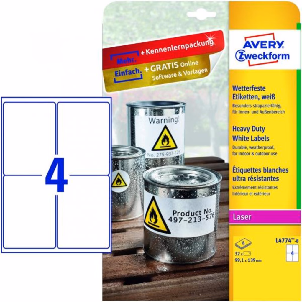 Etichette adesive in poliestere bianco extra resistente, 99,1x139mm, 4 etichette per foglio, 20 ff