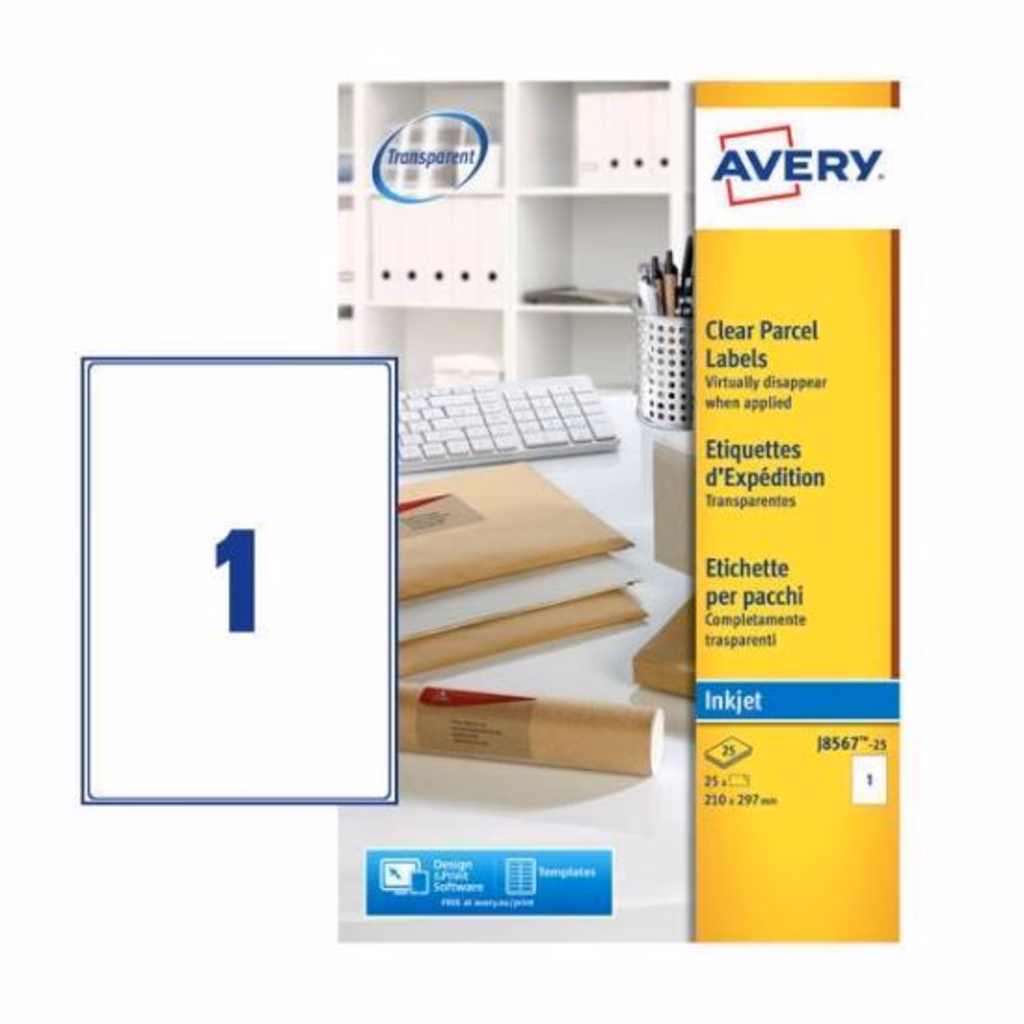 Etichette adesive in poliestere trasparente opaco, 210x297mm, 1 etichetta per foglio, 25 fogli