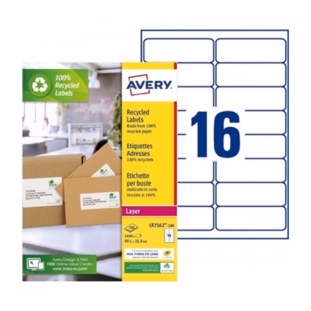 Il materiale di origine forestale in questo prodotto è riciclato. Punto di bianco molto simile a quello delle etichette in carta tradizionale. Grazie alla tecnologia JamFREE non si inceppano nella stampante così si evitano inutili sprechi. Crea il tuo progetto di stampa in pochi clic con il software gratuito Crea e Stampa Online di Avery.
