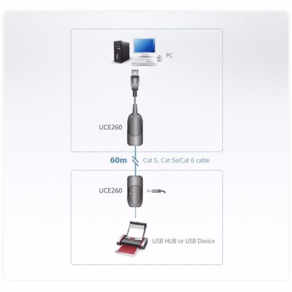 UCE260 consente di trasmettere in modo semplice i segnali USB tramite un cavo Cat.5/5e/6 fino a 60 metri (196 piedi) con una velocità di trasferimento dei dati High Speed (480Mb/s), Full Speed (12Mb/s) e Low Speed (1.5Mb/s). Senza alcuna configurazione o driver software, questo estensore USB consente di distanziare il dispositivo USB o hub fino a 60m dal computer, superando le tipiche limitazioni dei cavi USB.