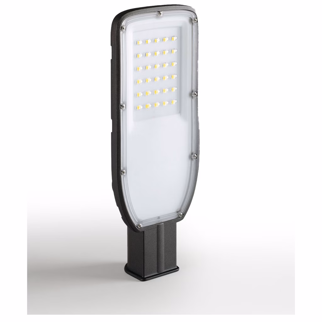 Faro stradale LED integrato struttura in alluminio pressofuso e diffusore con lenti in materiale autoestinguente, antiurto, anti-UV - temperatura colore: 4000K - durata 30.000 ore, 15.000 accensioni - uso esterno grado di protezione IP65 - luce naturale - Colore: antracite