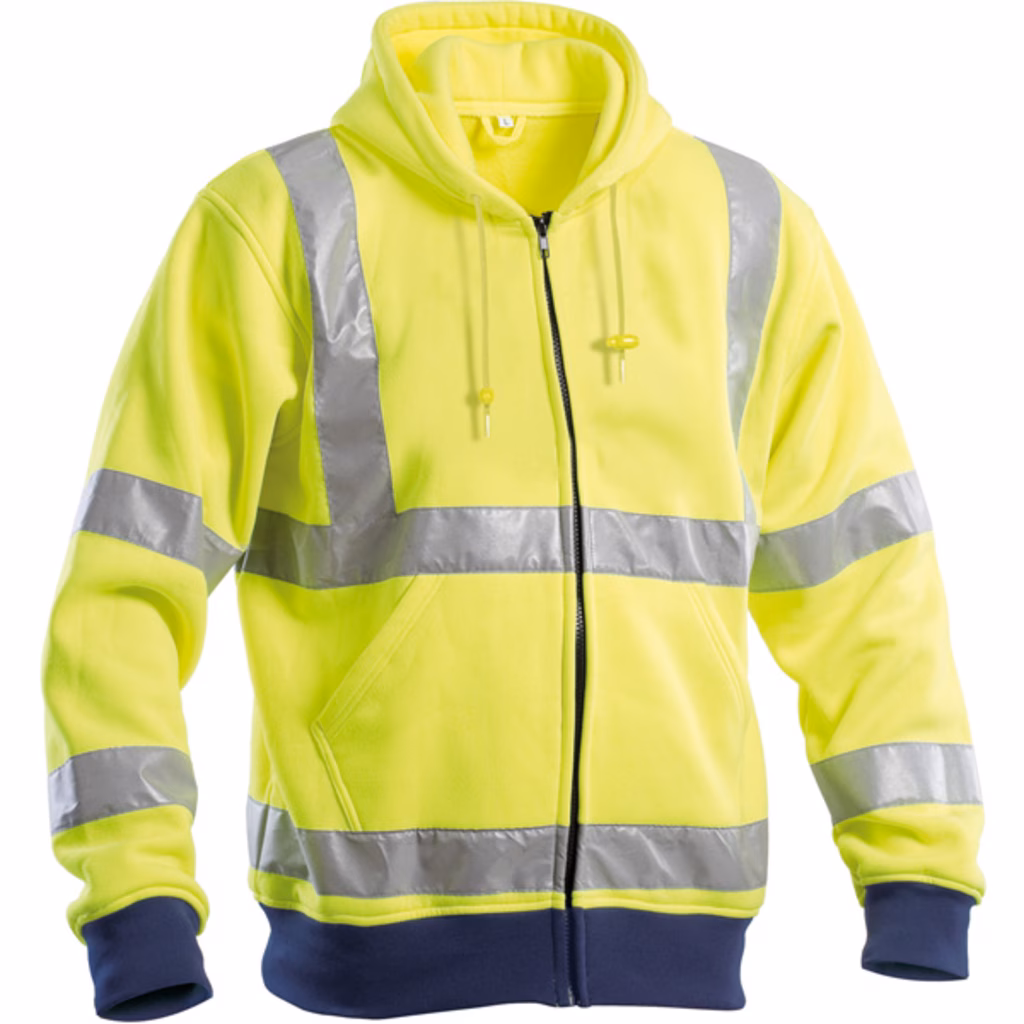 Felpa alta visibilità - chiusura frontale con zip lunga - cappuccio inserito nel collo con coulisse e fermacorda - due tasche laterali a marsupio - polsino e fondo manica in maglina colore blu navy