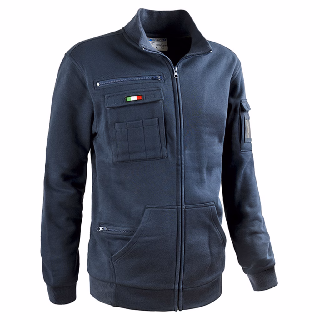 Felpa 65% cotone/35% poliestere - zip intera - rib in vita ai polsi e al collo - tasca con cerniera sul petto - tasca con velcro sul petto - tasca con cerniera in vita - 2 tasche laterali - tasca con velcro e portabadge manica sinistra