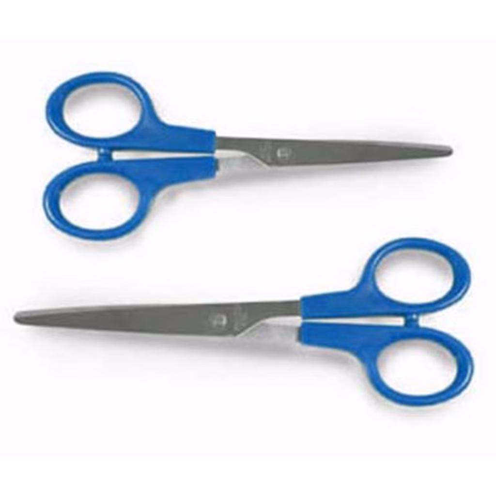Forbici con lame ben affilate in acciaio inox - impugnatura ergonomica di colore blu in plastica antiurto (ABS) - punte arrotondate - disponibili in due diverse misure