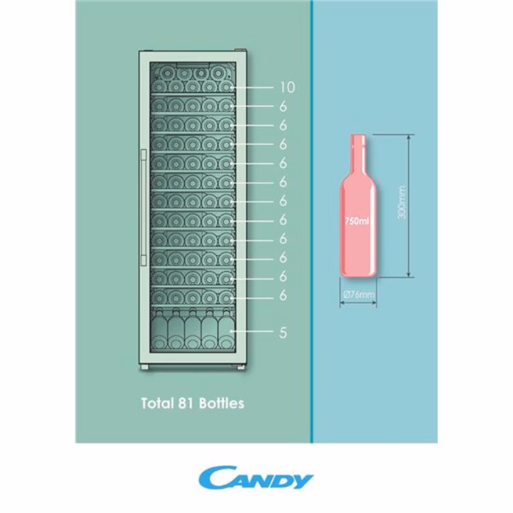 Candy CWC 200 EELW/NF Libera installazione Nero 81 bottiglia/bottiglieCandy CWC 200 EELW/NF. Posizionamento dell'apparecchio: Libera installazione, Colore struttura: Nero, Colore interno: Nero. Capacità bottiglie: 81 bottiglia/bottiglie, Intervallo temperatura (zona 1): 7 - 18 °C, Classe climatica: N-ST. Tipo di controllo: Pulsanti, Tipo di display: LED, Posizionamento del display: Interno. Classe efficienza energetica: G, Consumo energetico annuo: 158 kWh, Scala di efficienza energetica: Da A a G. Larghezza: 490 mm, Profondità: 545 mm, Altezza: 1460 mm