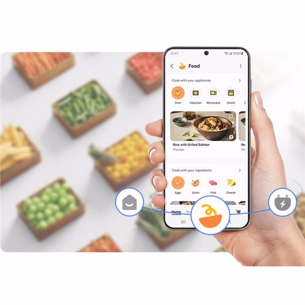 Da oggi potrai scegliere gli alimenti da acquistare e preparare le tue ricette in modo semplice ed efficace. Con SmartThings Food[6] potrai compilare una lista degli alimenti disponibili nel frigorifero e tenere sempre docchio le date di scadenza, per sapere subito e in ogni momento di cosa hai bisogno. Inoltre, il sistema ti propone ricette personalizzate in base alle tue preferenze alimentari e agli ingredienti disponibili.Efficienza costante[Va