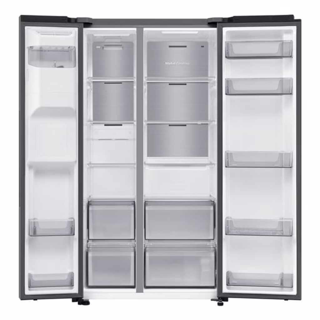 Il frigorifero RS70F64KETEF è perfetto per chi desidera massima capacità, tecnologia smart e un design moderno. Progettato per offrire il massimo della praticità, questo modello Side by Side garantisce una straordinaria capienza di 640 litri, ideale per famiglie numerose o per chi ama avere sempre a disposizione ingredienti freschi e ben organizzati. Grazie alla tecnologia Space Max, le pareti sono più sottili senza compromettere l isolamento termico, offrendo così più spazio interno senza aumentare le dimensioni esterne. Questo significa che puoi conservare più cibo, senza sacrificare lo stile e l armonia della tua cucina. Il frigorifero è dotato di WiFi e AI Energy Mode, un sistema intelligente che monitora e ottimizza il consumo energetico in tempo reale. Collegandolo all app SmartThings, puoi ricevere suggerimenti per ridurre i consumi e migliorare l efficienza, contribuendo a un risparmio in bolletta senza rinunciare alle prestazioni. Il pratico dispenser di acqua e ghiaccio ti offre freschezza immediata con un semplice tocco, senza bisogno di aprire il frigorifero. Perfetto per le calde giornate estive o per servire bevande sempre alla temperatura ideale. Il retro in Metal Back garantisce maggiore resistenza, sicurezza e una migliore dissipazione del calore, contribuendo alla durata del frigorifero nel tempo. Il design minimalista e sofisticato si adatta a qualsiasi stile di cucina, donando un tocco di modernità ed eleganza.
