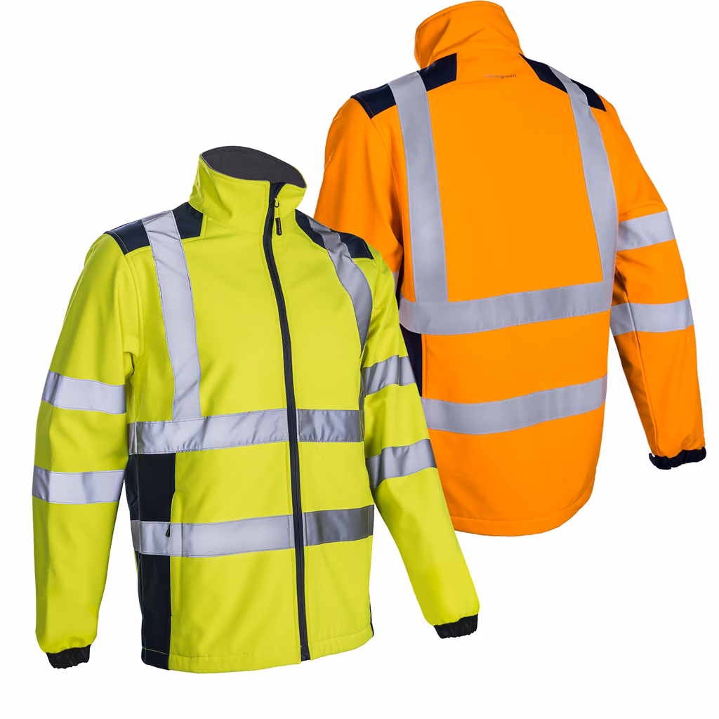 Softshell ad alta visibilità a 3 strati con membrana TPU impermeabile e traspirante (8000 mm / 3000 g/m²/24h), realizzato in poliestere con stretch meccanico e interno in micropile da 295 g/m², dotato di inserti in contrasto su spalle, fianchi e polsini, bande retroriflettenti cucite da 5 cm (2 bretelle, 2 in vita e 2 bracciali), due tasche al petto con zip sotto bordino, chiusura centrale con cerniera, polsini elasticizzati, collo alto e certificazioni EN ISO 20471:2013 + A1:2016 (Classe 2 per la taglia S, Classe 3 da M in su) ed EN14058:2017, DPI di Categoria II.