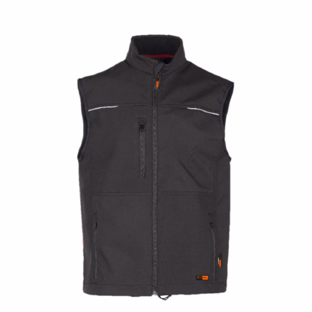 Gilet Softshell con 3 tasche - fondo posteriore sagomato - fodera in rete, piping rifrangente - fondo giacca regolabile con coulisse - tasche posteriori porta utensili e cellulare - impermeabilità colonna d'acqua 10.000 mm - zip YKK