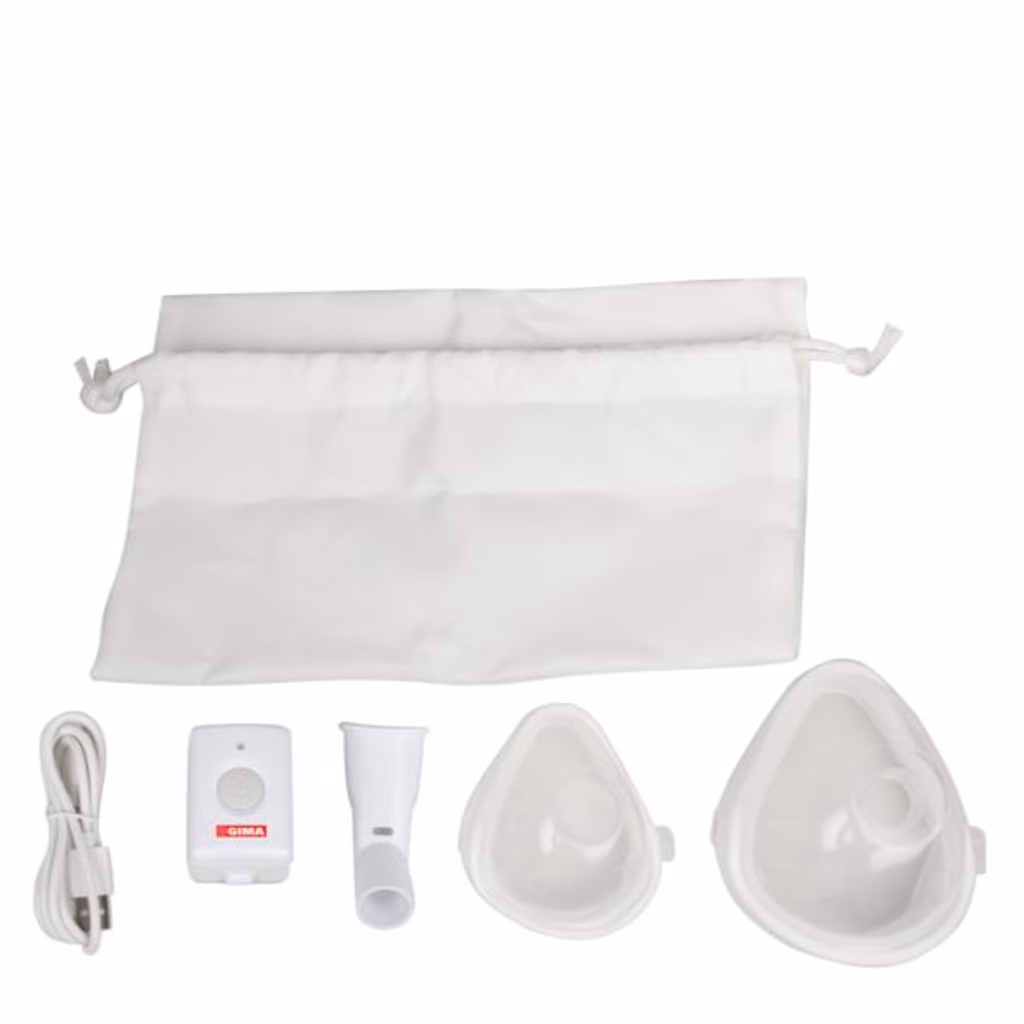 Fornito con mascherina per adulti, mascherina pediatrica, boccaglio per inalazione, batteria integrata, cavo di tipo C e manuale multilingue GB, FR, IT, ES, PT, DE, DK, RO, HR, GR.