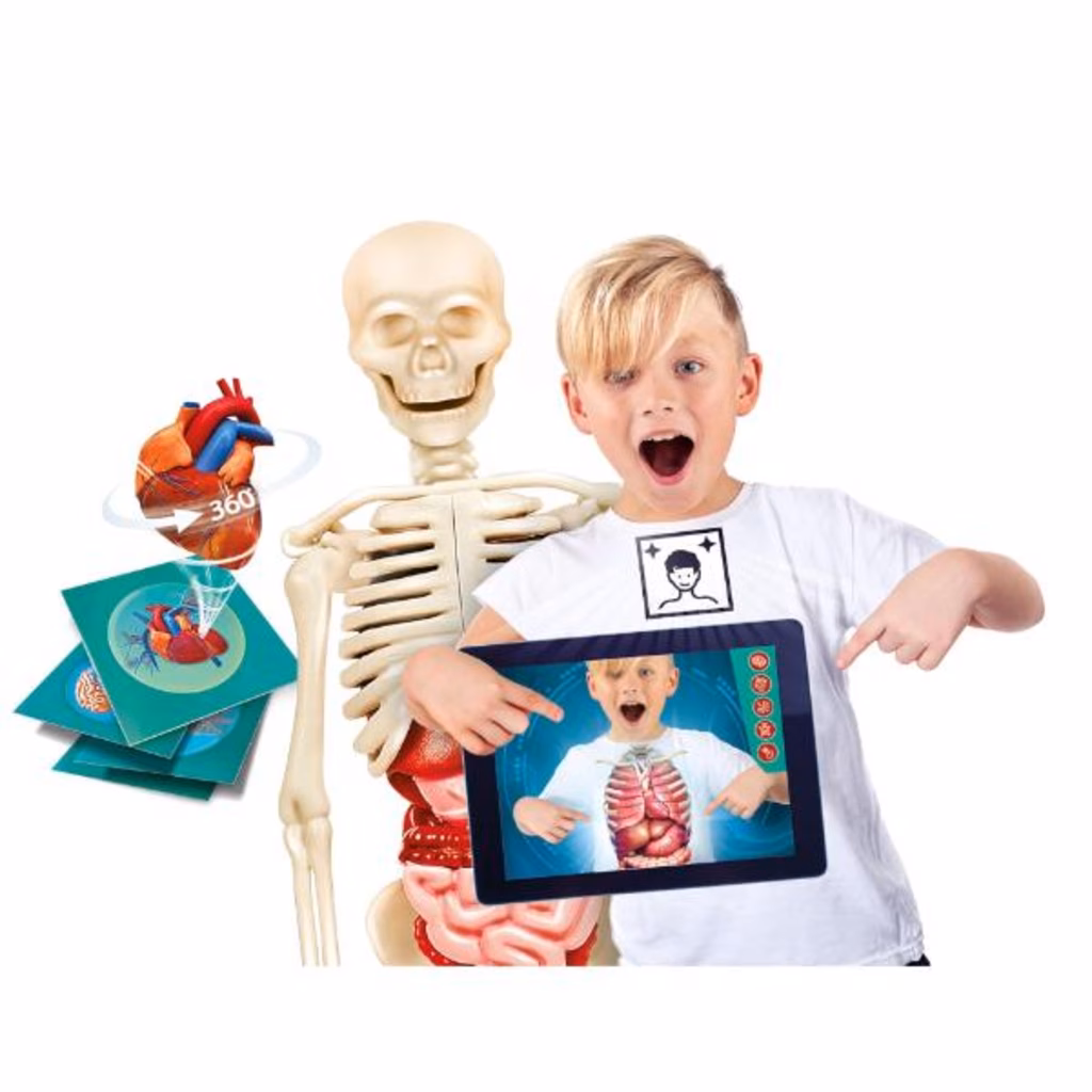 CONTENUTO DEL GIOCO: organi e scheletro umano in 3D da assemblare, carte illustrate da utilizzare con App e manuale scientifico illustrato